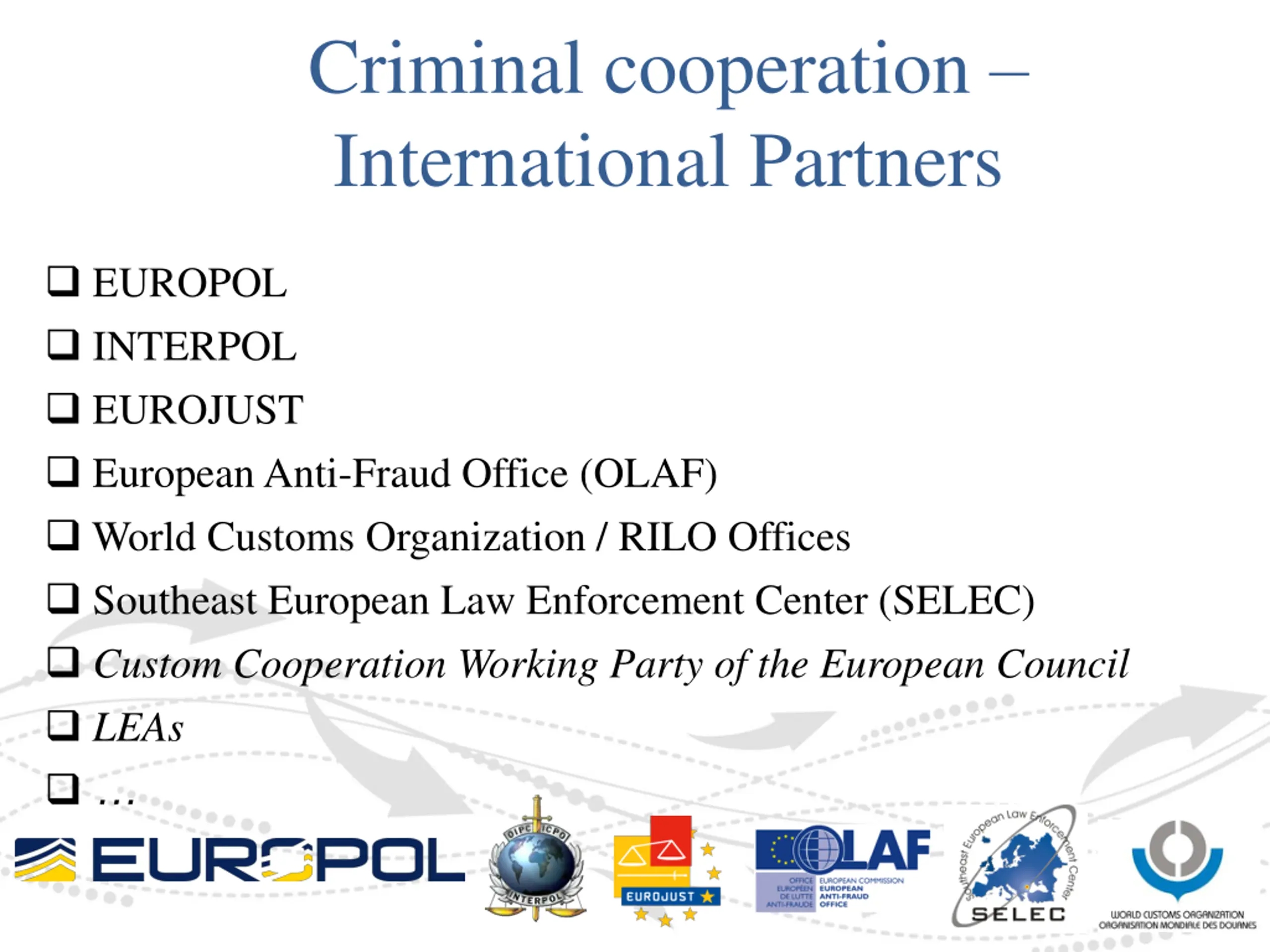 Criminal cooperation International Partners EUROPOL INTERPOL EUROJUST European Anti-Fraud Office (OLAF) World Customs Organization / RILO Offices Southeast European Law Enforcement Center (SELEC) Custom Cooperation Working Party of the European Council LEAs 8