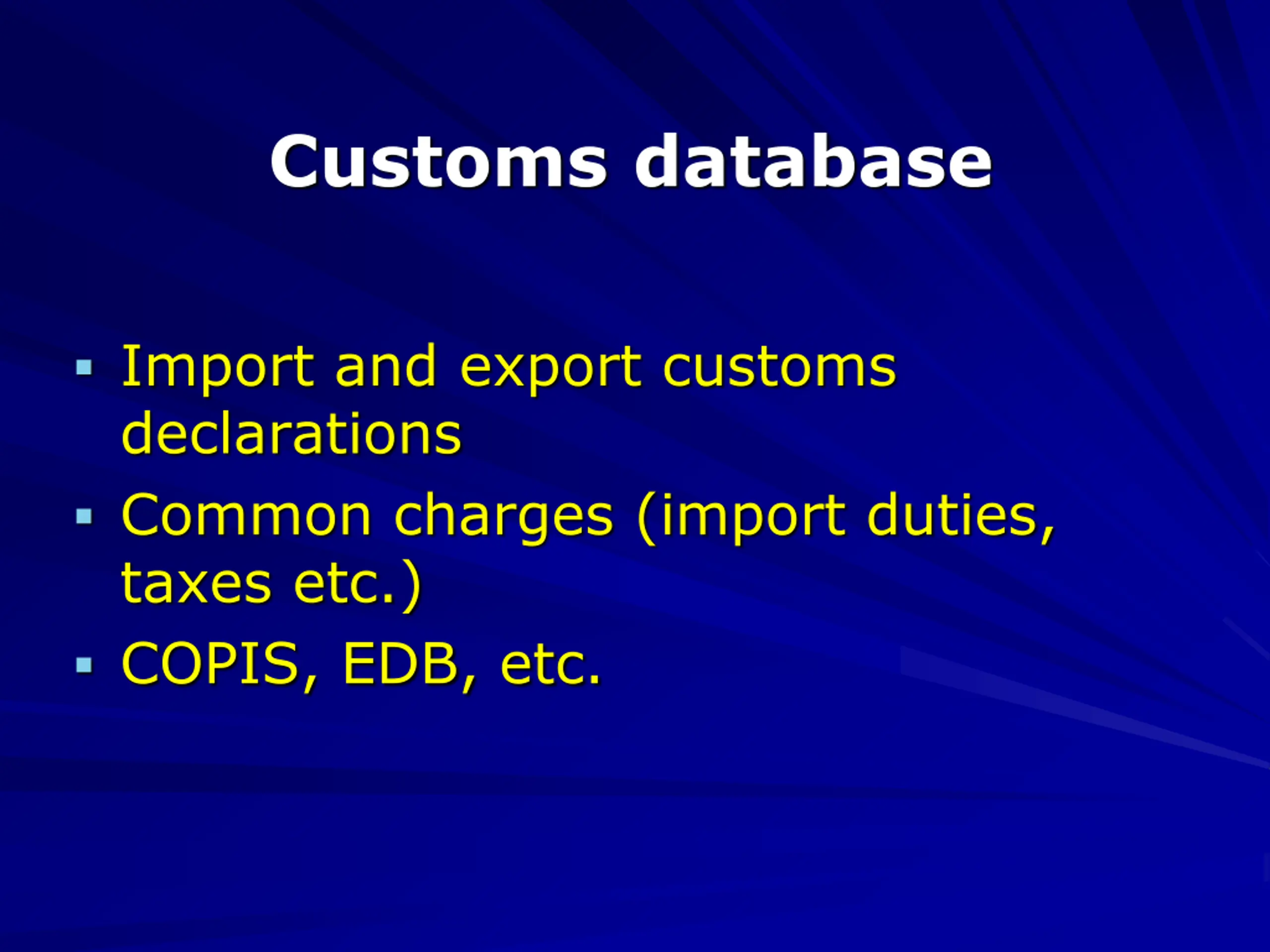 Customs database Import and export customs declarations Common charges (import duties, taxes etc.) COPIS, EDB, etc.