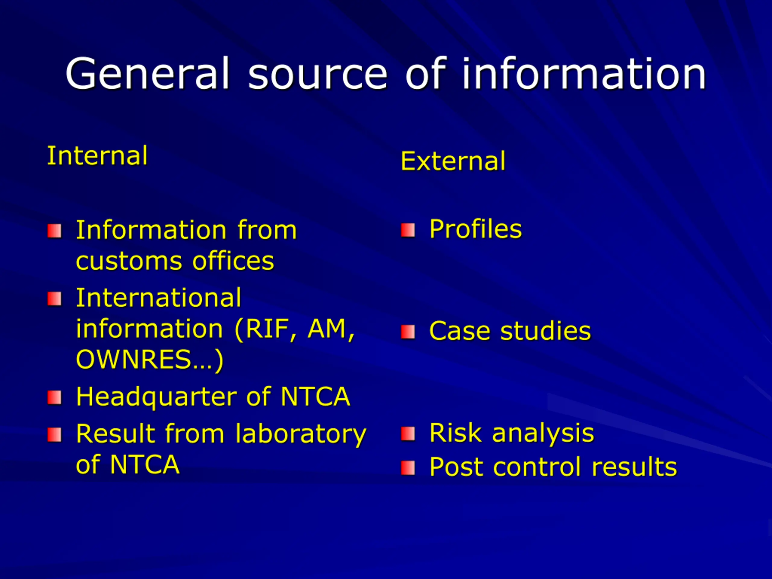 General source of information Internal External Profiles Information from customs offices International information (RIF, AM, OWNRES ) Headquarter of NTCA Result from laboratory of NTCA Case studies Risk analysis Post control results