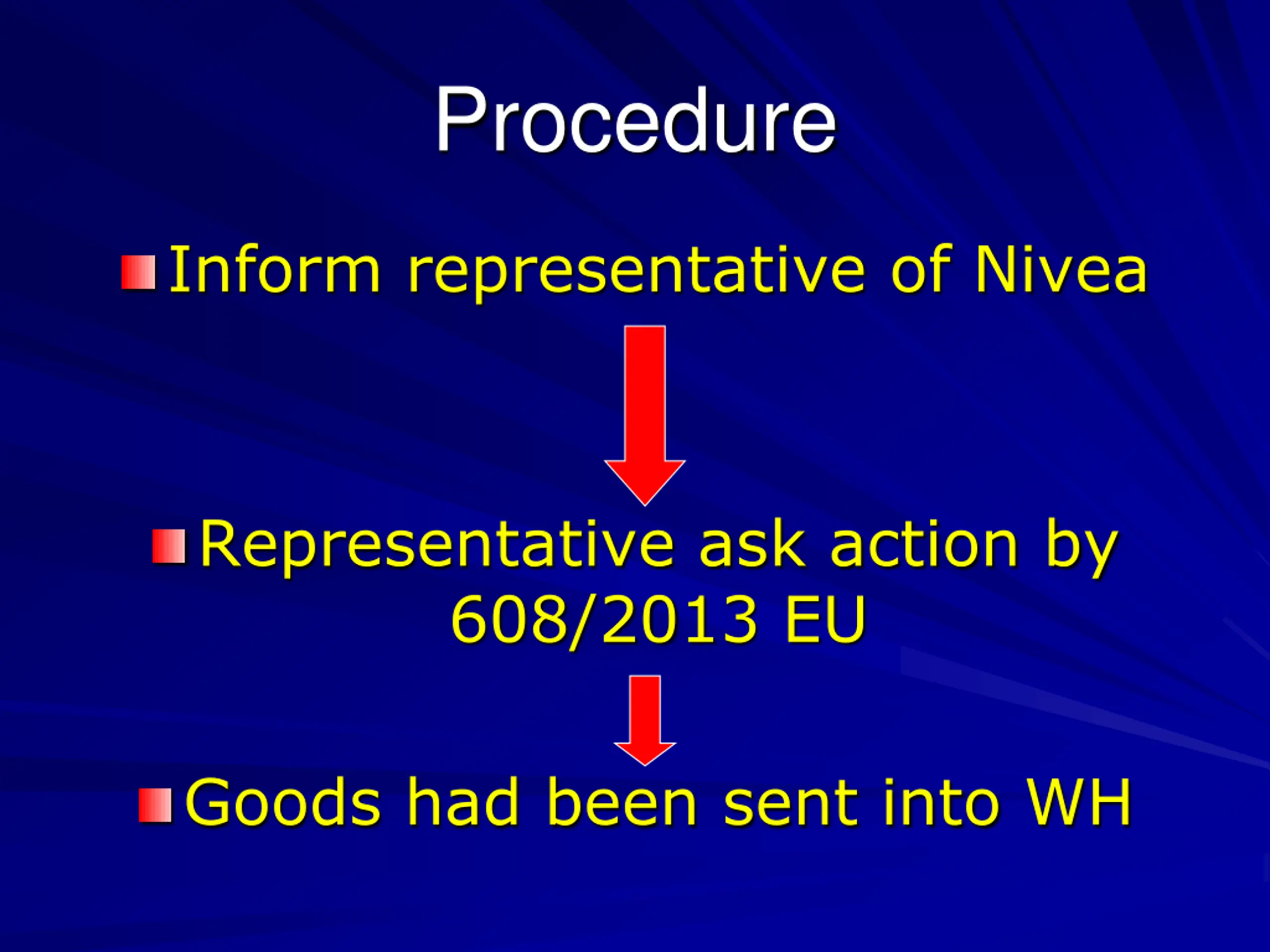 Procedure Inform representative of Nivea Representative ask action by 608/2013 EU Goods had been sent into WH