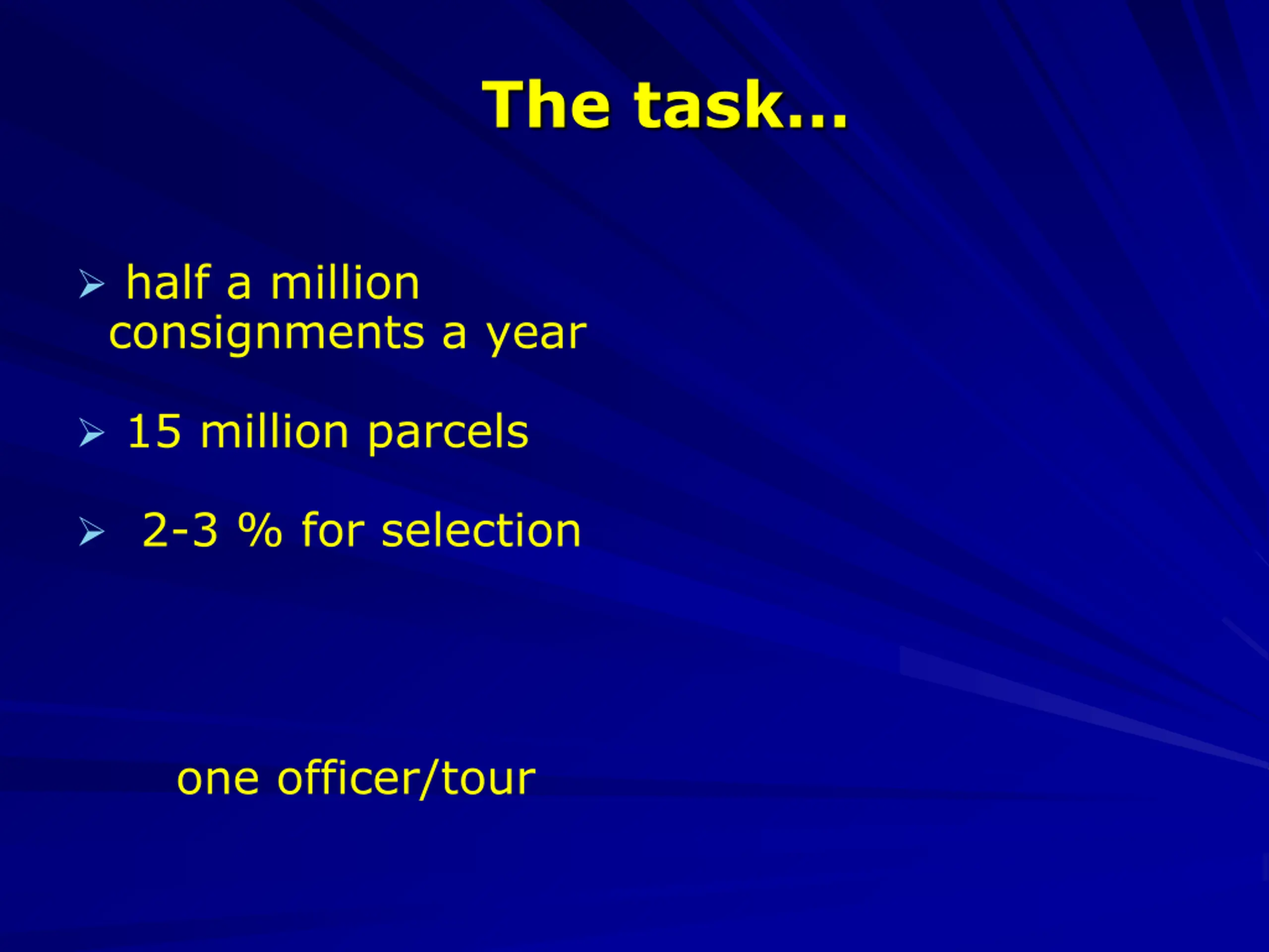 The task half a million consignments a year 15 million parcels 2-3 % for selection one officer/tour