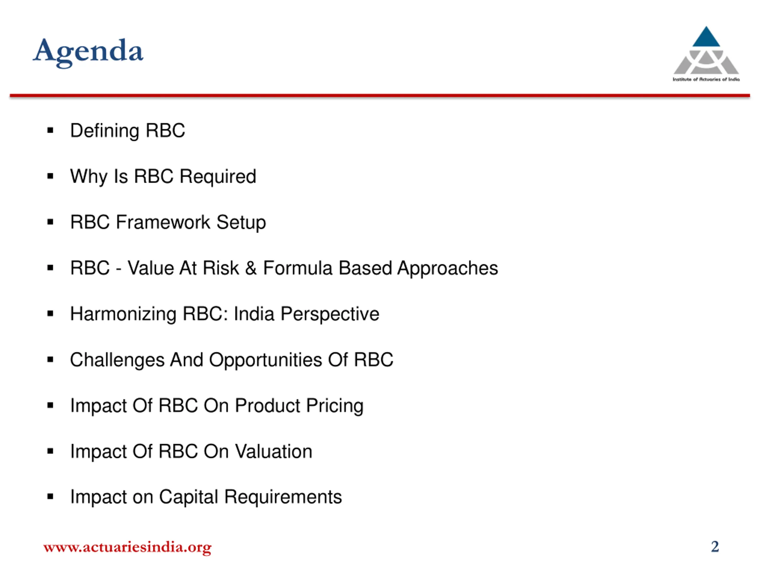Agenda Defining RBC Why Is RBC Required RBC Framework Setup RBC - Value At Risk & Formula Based Approaches Harmonizing RBC: India Perspective Challenges And Opportunities Of RBC Impact Of RBC On Product Pricing Impact Of RBC On Valuation Impact on Capital Requirements www.actuariesindia.org 2