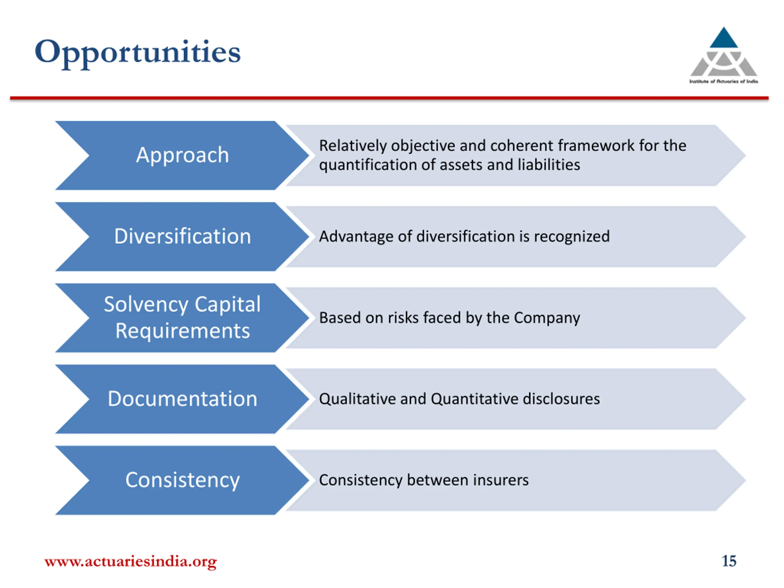Opportunities Relatively objective and coherent framework for the quantification of assets and liabilities Approach Diversification Advantage of diversification is recognized Solvency Capital Requirements Based on risks faced by the Company Documentation Qualitative and Quantitative disclosures Consistency Consistency between insurers www.actuariesindia.org 15