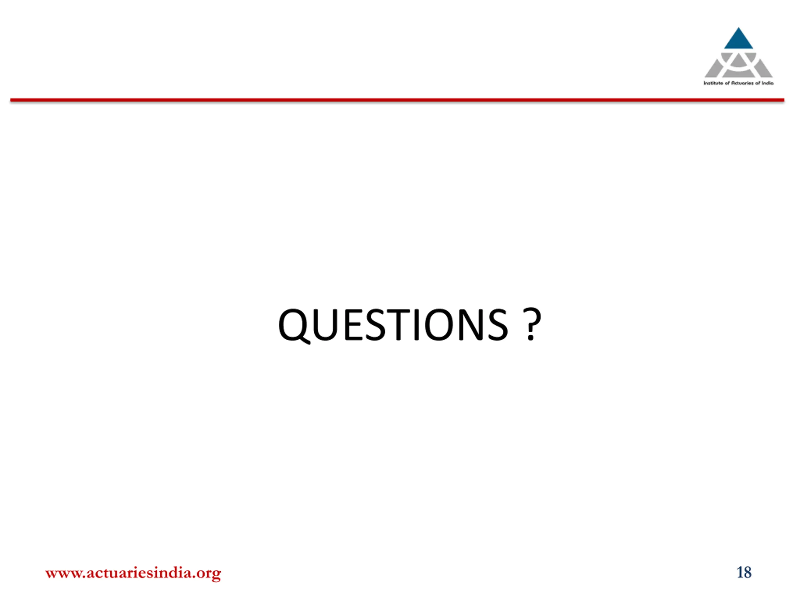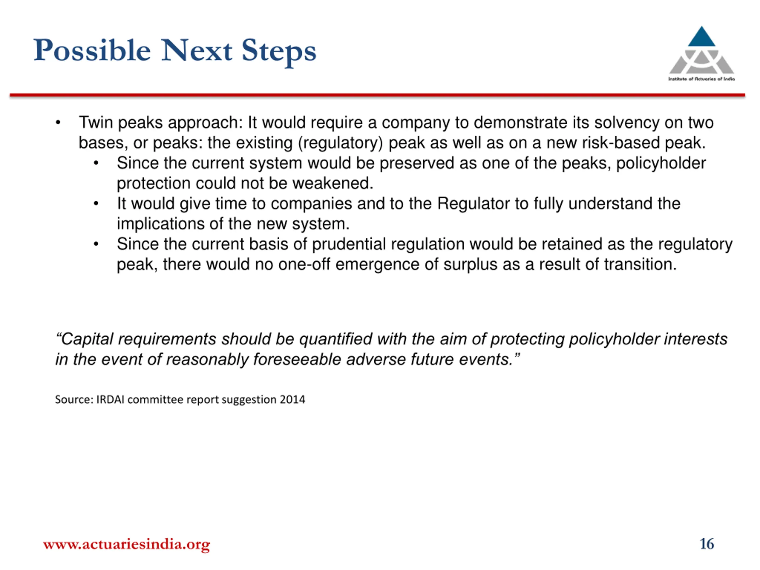 PossibleNext Steps Twin peaks approach: It would require a company to demonstrate its solvency on two bases, or peaks: the existing (regulatory) peak as well as on a new risk-based peak. Since the current system would be preserved as one of the peaks, policyholder protection could not be weakened. It would give time to companies and to the Regulator to fully understand the implications of the new system. Since the current basis of prudential regulation would be retained as the regulatory peak, there would no one-off emergence of surplus as a result of transition. Capital requirements should be quantified with the aim of protecting policyholder interests in the event of reasonably foreseeable adverse future events. Source: IRDAI committee report suggestion 2014 www.actuariesindia.org 16