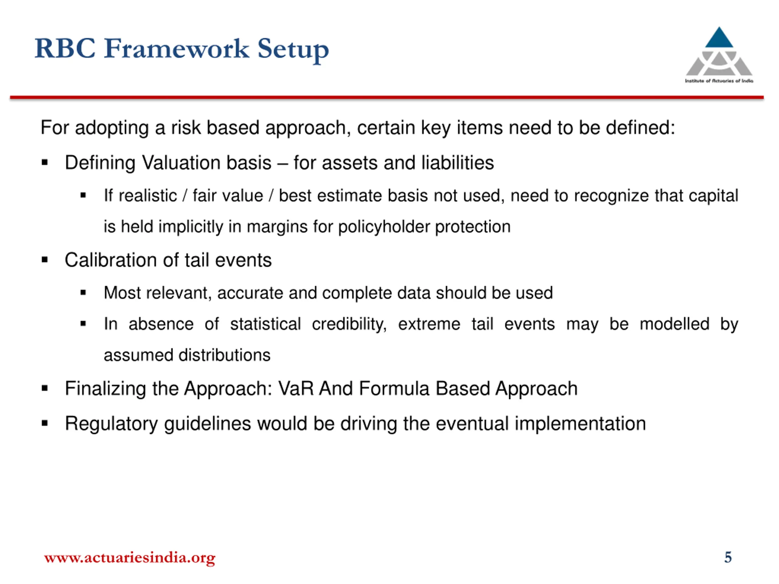 Why Is RBC Required Current approach of solvency calculation is a factor based method Broad brush (Approximate) approach No diversification benefits to Insurer of the business mix / asset mix No / Limited Incentive for risk management initiatives by Company Benefits of Risk Based Capital Approach: Holistic approach to risk measurement Net risk exposure computations Diversification benefits allowed for Interactions between risks allowed Mortality and Longevity risks offsetting the net risk exposure Incentives for effective risk management practices IRDAI has already taken various steps as a pre-cursor to adopting RBC framework www.actuariesindia.org 4