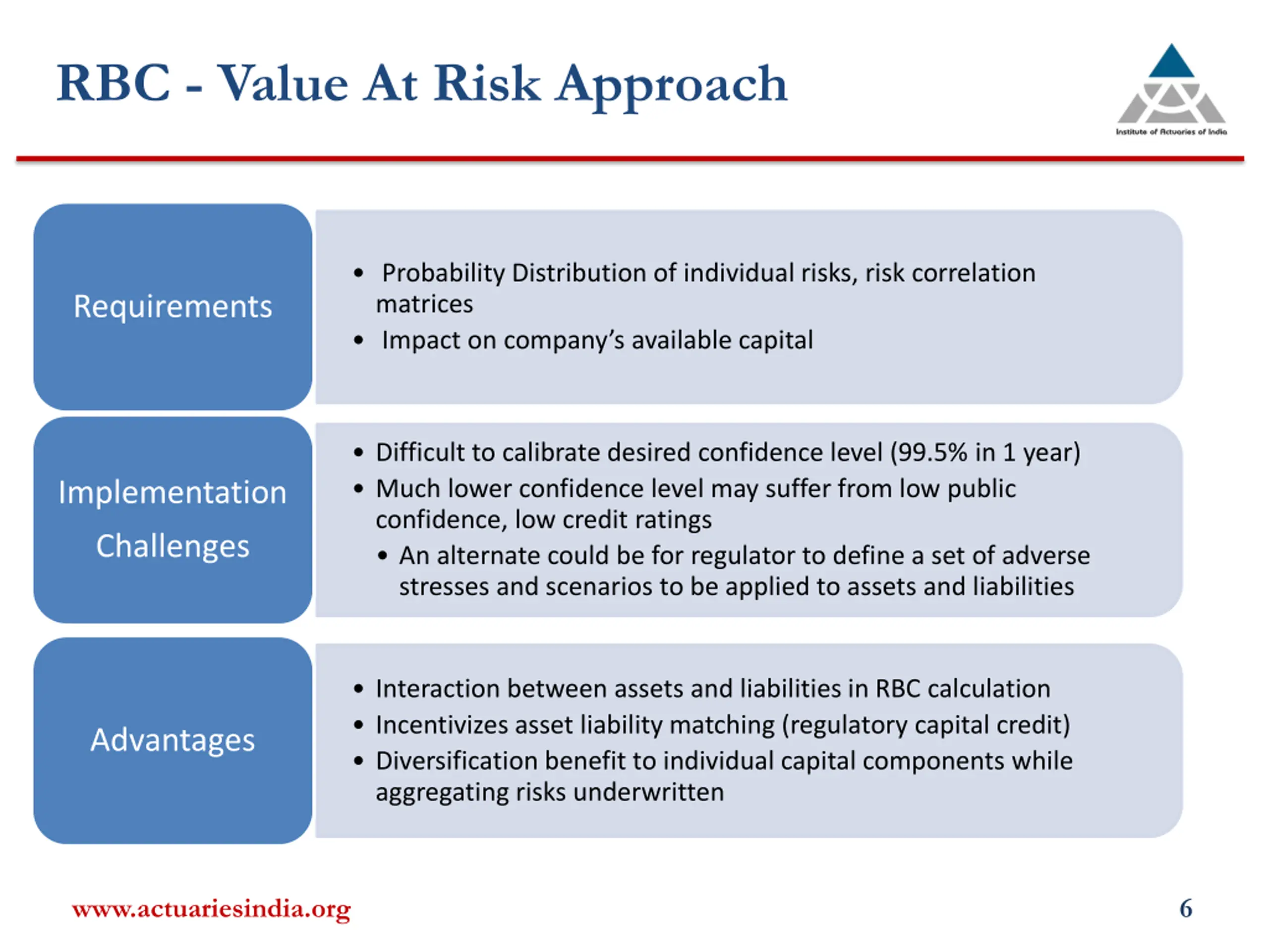 RBC Framework Setup For adopting a risk based approach, certain key items need to be defined: Defining Valuation basis for assets and liabilities If realistic / fair value / best estimate basis not used, need to recognize that capital is held implicitly in margins for policyholder protection Calibration of tail events Most relevant, accurate and complete data should be used In absence of statistical credibility, extreme tail events may be modelled by assumed distributions Finalizing the Approach: VaR And Formula Based Approach Regulatory guidelines would be driving the eventual implementation www.actuariesindia.org 5