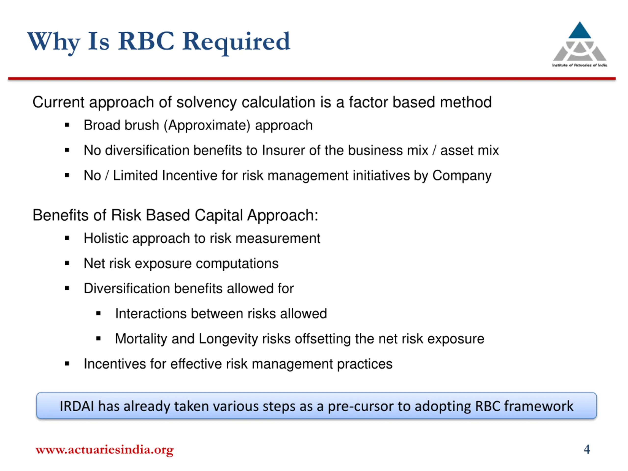 Defining RBC Risk-based capital (RBC) represents* an amount of capital based on an assessment of risks that a company should hold to protect customers against adverse developments. Insurance companies across the globe have moved/are moving towards adopting a regime which makes sufficient allowance for risk in the business Different methods & formulae used by regulators, managements and rating agencies May differ by provider type i.e. life / health / property & casualty Approach Usually expressed in the form of a ratio: RBC Ratio Ratio of Company s Total Capital and company s RBC Representation Depends upon computation basis Depends upon the underlying implicit assumptions Interpretation www.actuariesindia.org 3 *Definition from SOA RMTF http://rmtf.soa.org/riskbased_capital.pdf