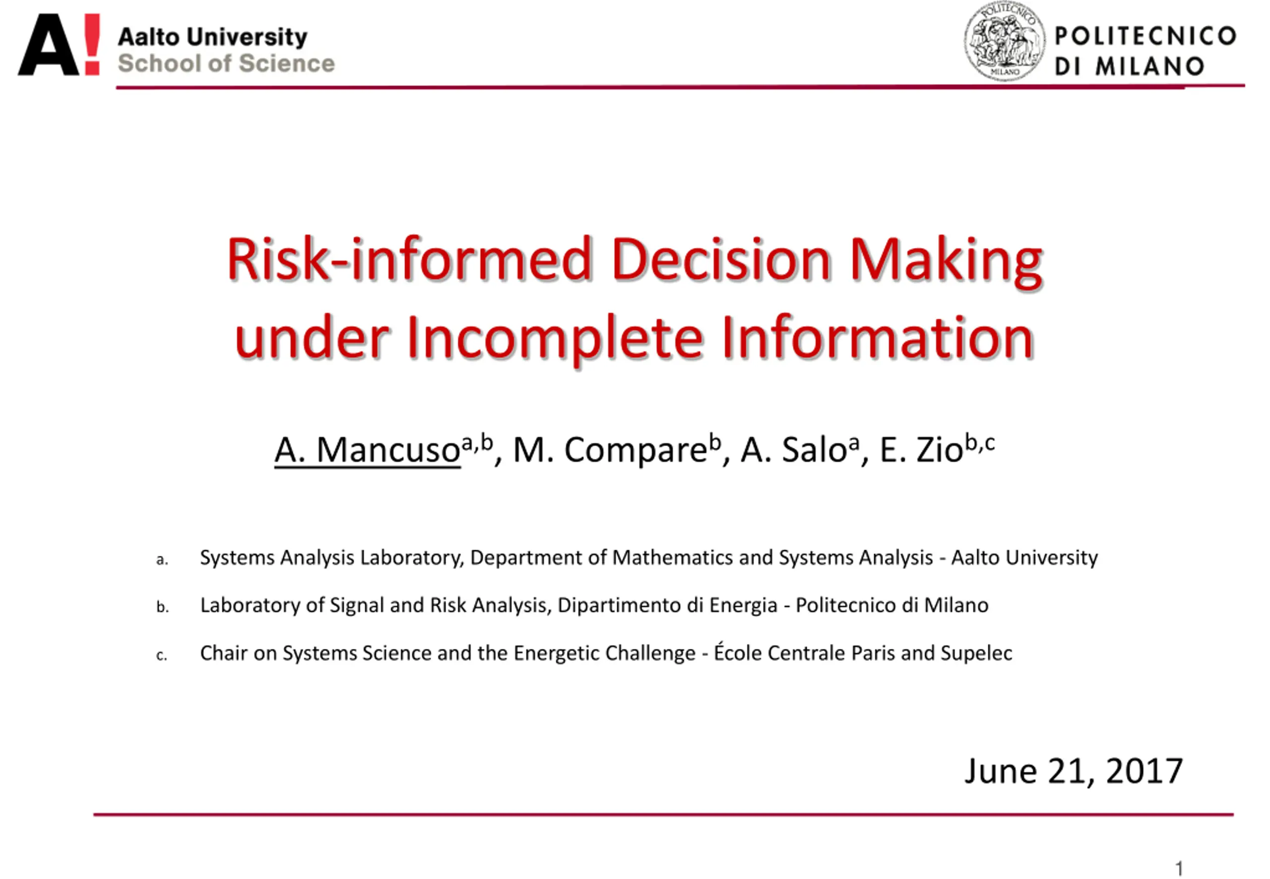 Risk-informed Decision Making under Incomplete Information A. Mancusoa,b, M. Compareb, A. Saloa, E. Ziob,c Systems Analysis Laboratory, Department of Mathematics and Systems Analysis - Aalto University a. Laboratory of Signal and Risk Analysis, Dipartimento di Energia - Politecnico di Milano b. Chair on Systems Science and the Energetic Challenge - cole Centrale Paris and Supelec c. June 21, 2017 1