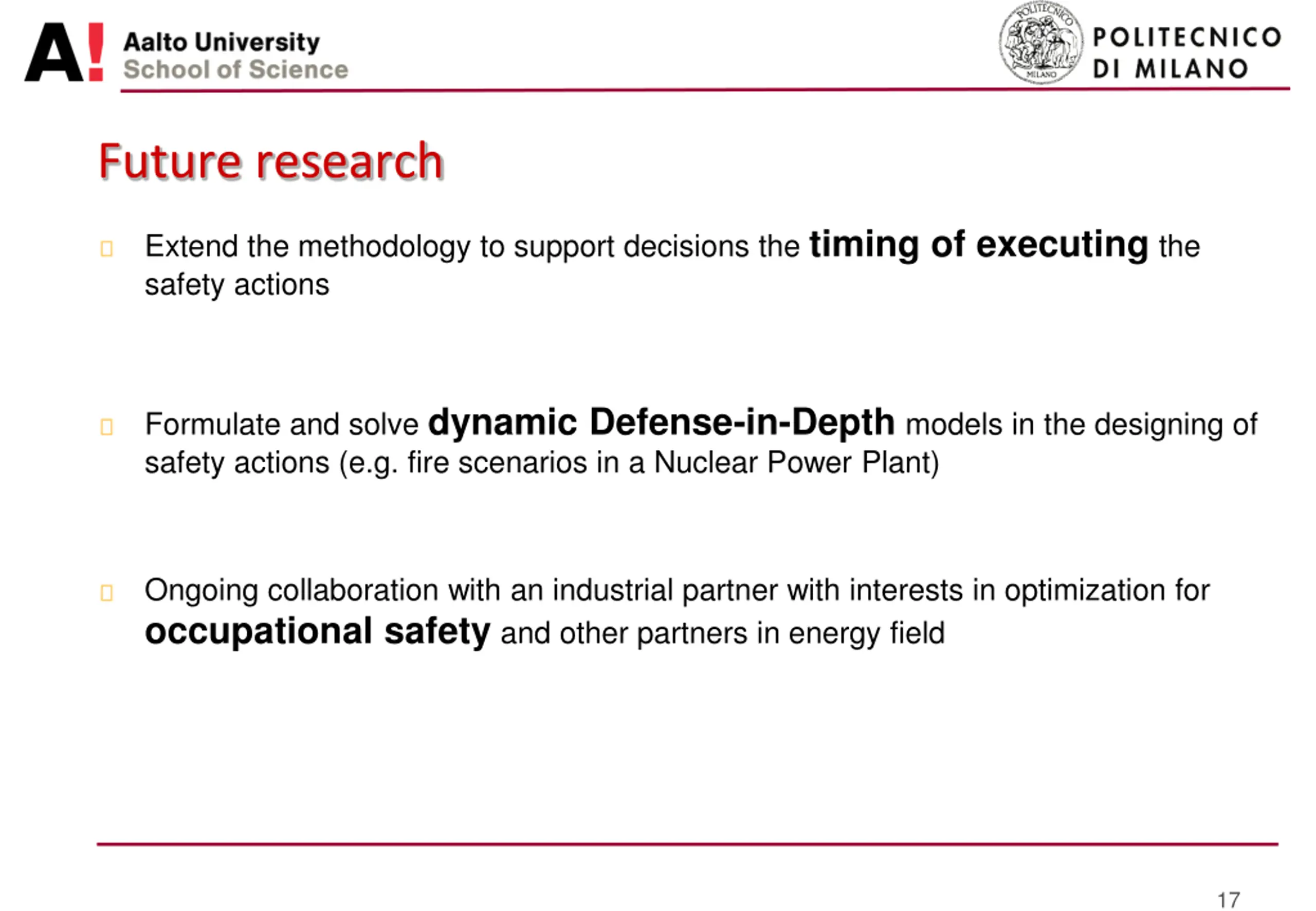 Future research Extend the methodology to support decisions the timing of executing the safety actions Formulate and solve dynamic Defense-in-Depth models in the designing of safety actions (e.g. fire scenarios in a Nuclear Power Plant) Ongoing collaboration with an industrial partner with interests in optimization for occupational safety and other partners in energy field 17