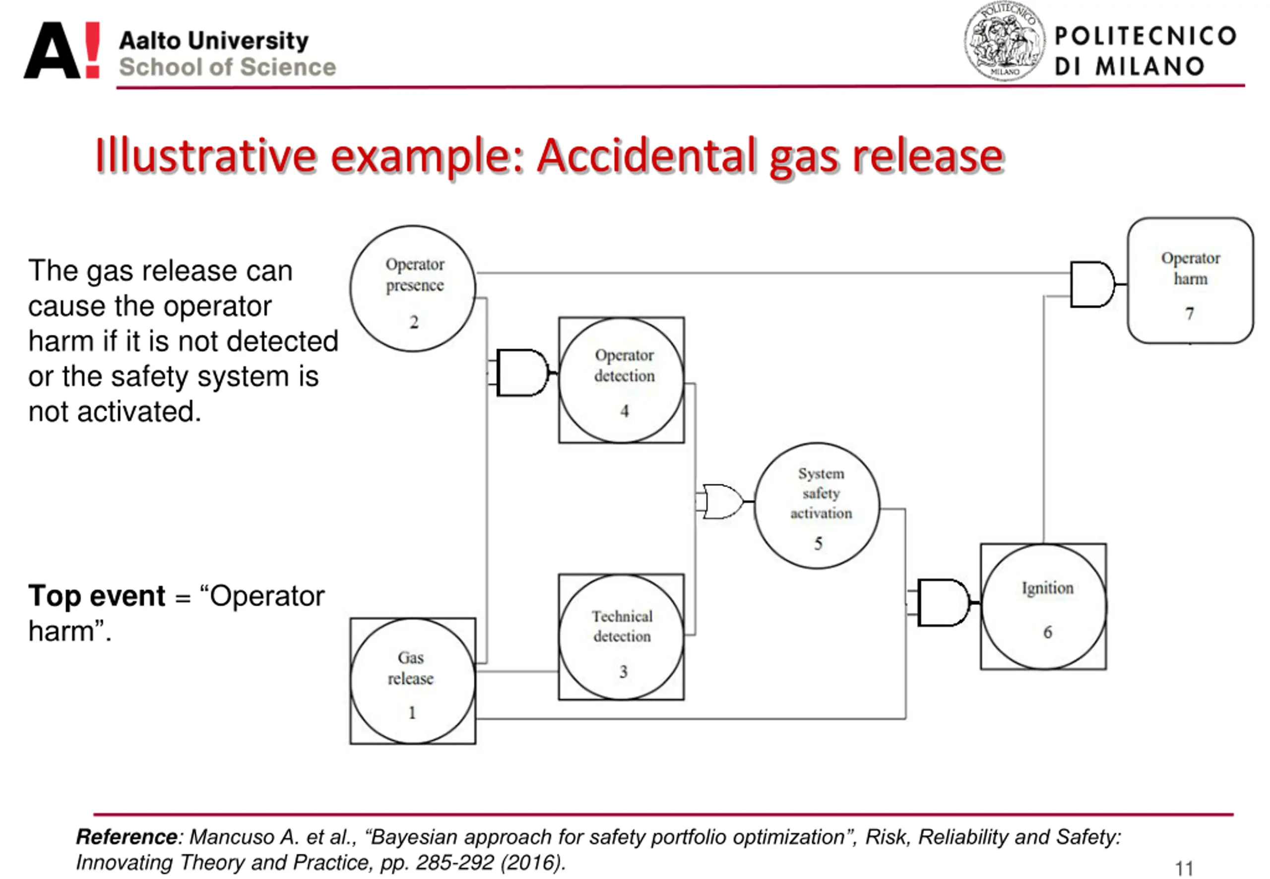 Illustrative example: Accidental gas release The gas release can cause the operator harm if it is not detected or the safety system is not activated. Top event = Operator harm . Reference: Mancuso A. et al., Bayesian approach for safety portfolio optimization , Risk, Reliability and Safety: Innovating Theory and Practice, pp. 285-292 (2016). 11