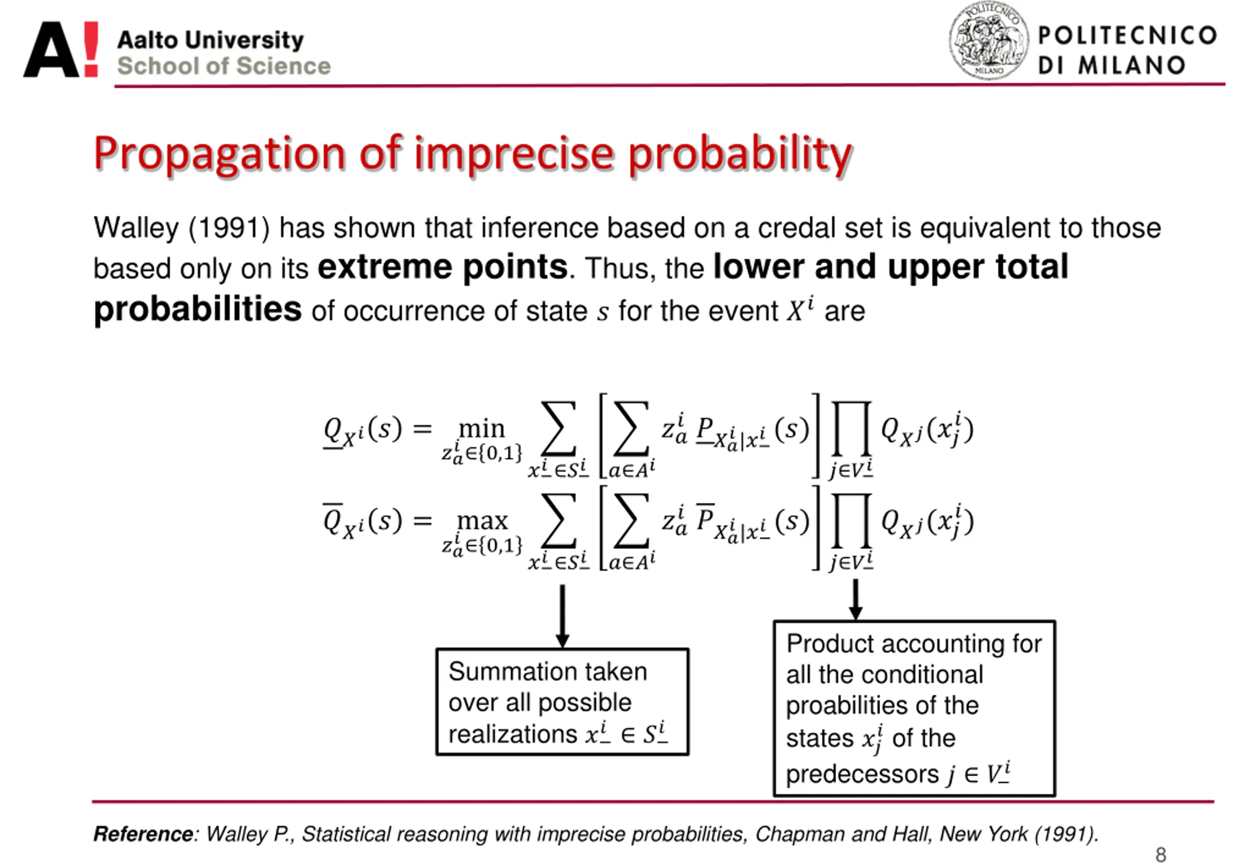 Propagation of imprecise probability Walley (1991) has shown that inference based on a credal set is equivalent to those based only on its extreme points. Thus, the lower and upper total probabilities of occurrence of state ? for the event ?? are ?) ???? ??? ? = min ?? ? (?) ???(?? ?|? ? 0,1 ?? ? ? ? ? ?? ? ? ? ? ?) ???? ??? ? = max ?? ? (?) ???(?? ?|? ? 0,1 ?? ? ? ? ? ?? ? ? ? ? Product accounting for all the conditional proabilities of the states ?? predecessors ? ? ? Summation taken over all possible realizations ? ? ? ? ? of the Reference: Walley P., Statistical reasoning with imprecise probabilities, Chapman and Hall, New York (1991). 8