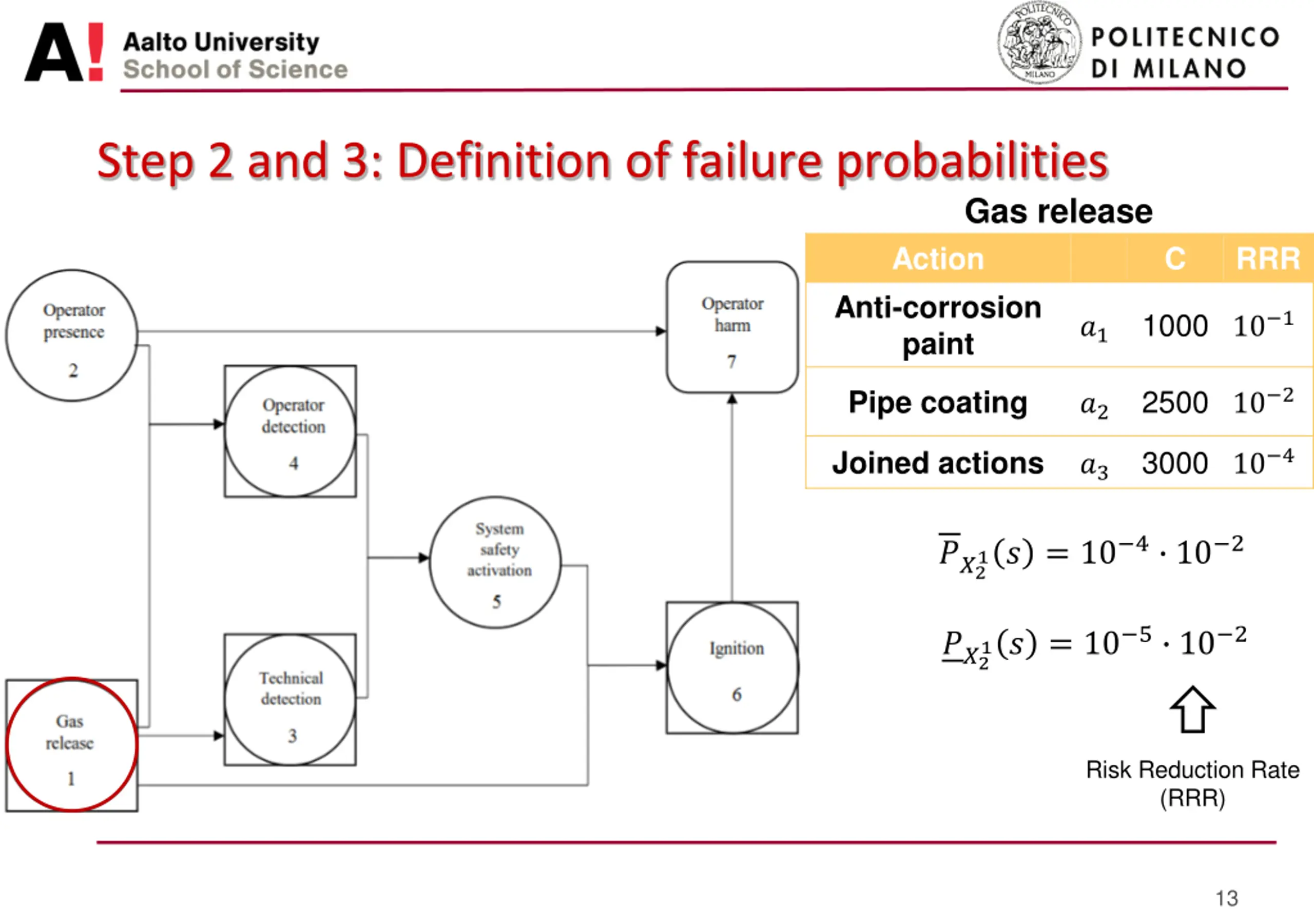 Step 2 and 3: Definition of failure probabilities Gas release Action Anti-corrosion paint C RRR 1000 10 1 ?1 2500 10 2 Pipe coating ?2 3000 10 4 Joined actions ?3 1 ? = 10 4 10 2 ??2 1 ? = 10 5 10 2 ??2 Risk Reduction Rate (RRR) 13