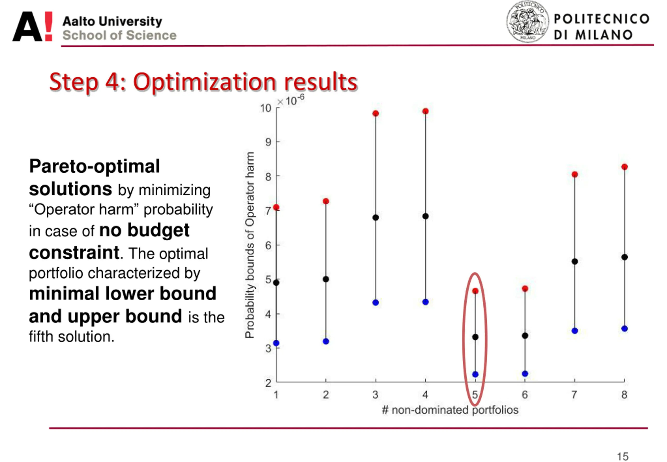 Step 4: Optimization results Pareto-optimal solutions by minimizing Operator harm probability in case of no budget constraint. The optimal portfolio characterized by minimal lower bound and upper bound is the fifth solution. 15