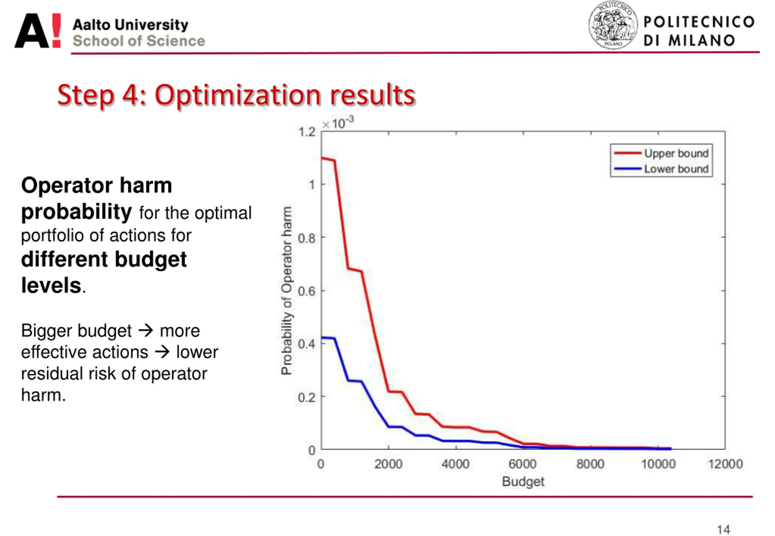 Step 4: Optimization results Operator harm probability for the optimal portfolio of actions for different budget levels. Bigger budget more effective actions lower residual risk of operator harm. 14