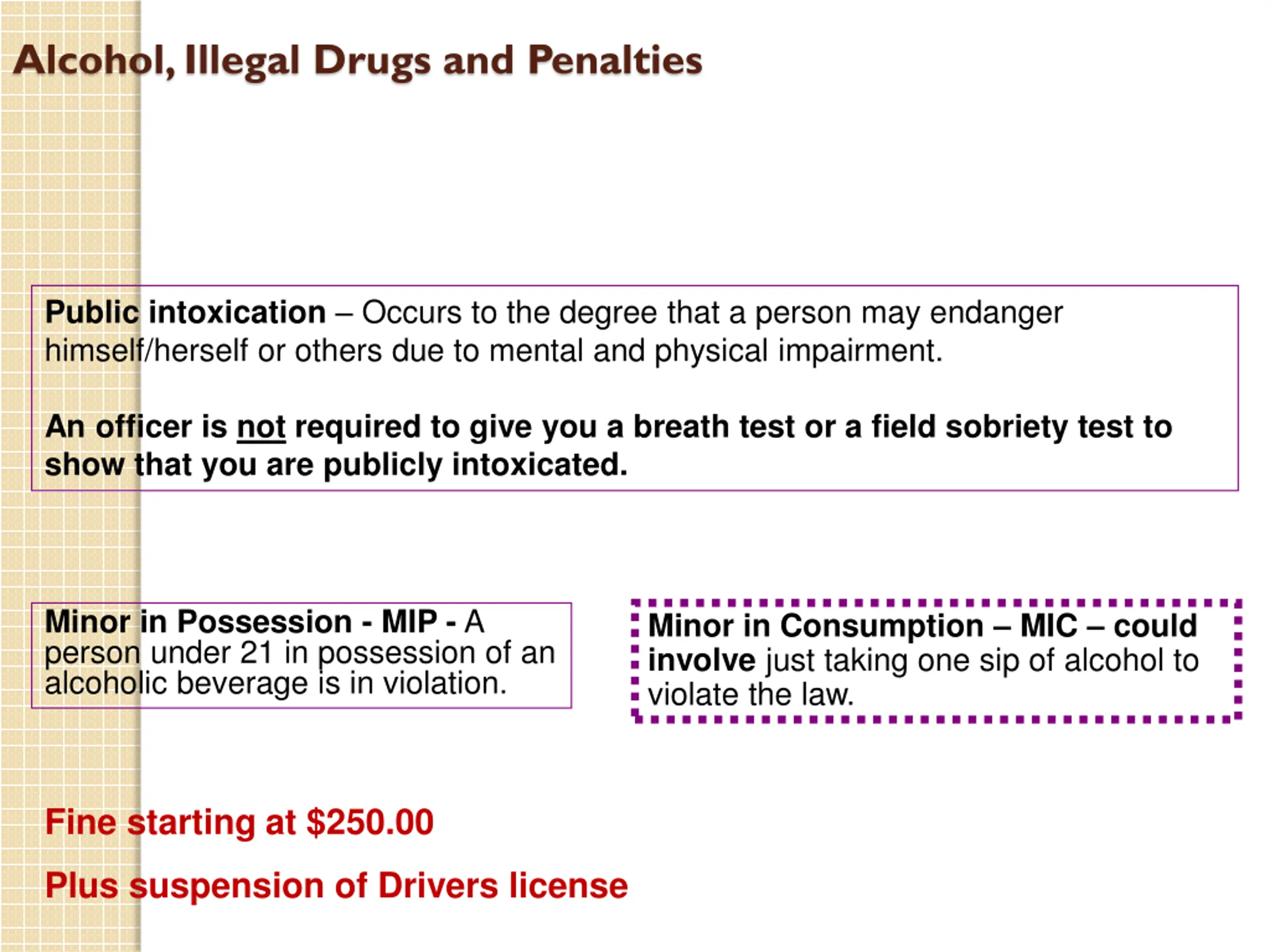 Alcohol, Illegal Drugs and Penalties Public intoxication Occurs to the degree that a person may endanger himself/herself or others due to mental and physical impairment. An officer is not required to give you a breath test or a field sobriety test to show that you are publicly intoxicated. Minor in Possession - MIP - A person under 21 in possession of an alcoholic beverage is in violation. Minor in Consumption MIC could involve just taking one sip of alcohol to violate the law. Fine starting at $250.00 Plus suspension of Drivers license