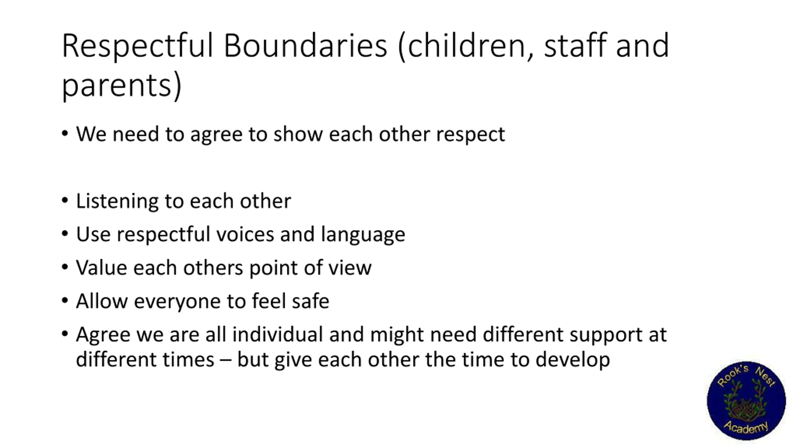 Respectful Boundaries (children, staff and parents) We need to agree to show each other respect Listening to each other Use respectful voices and language Value each others point of view Allow everyone to feel safe Agree we are all individual and might need different support at different times but give each other the time to develop