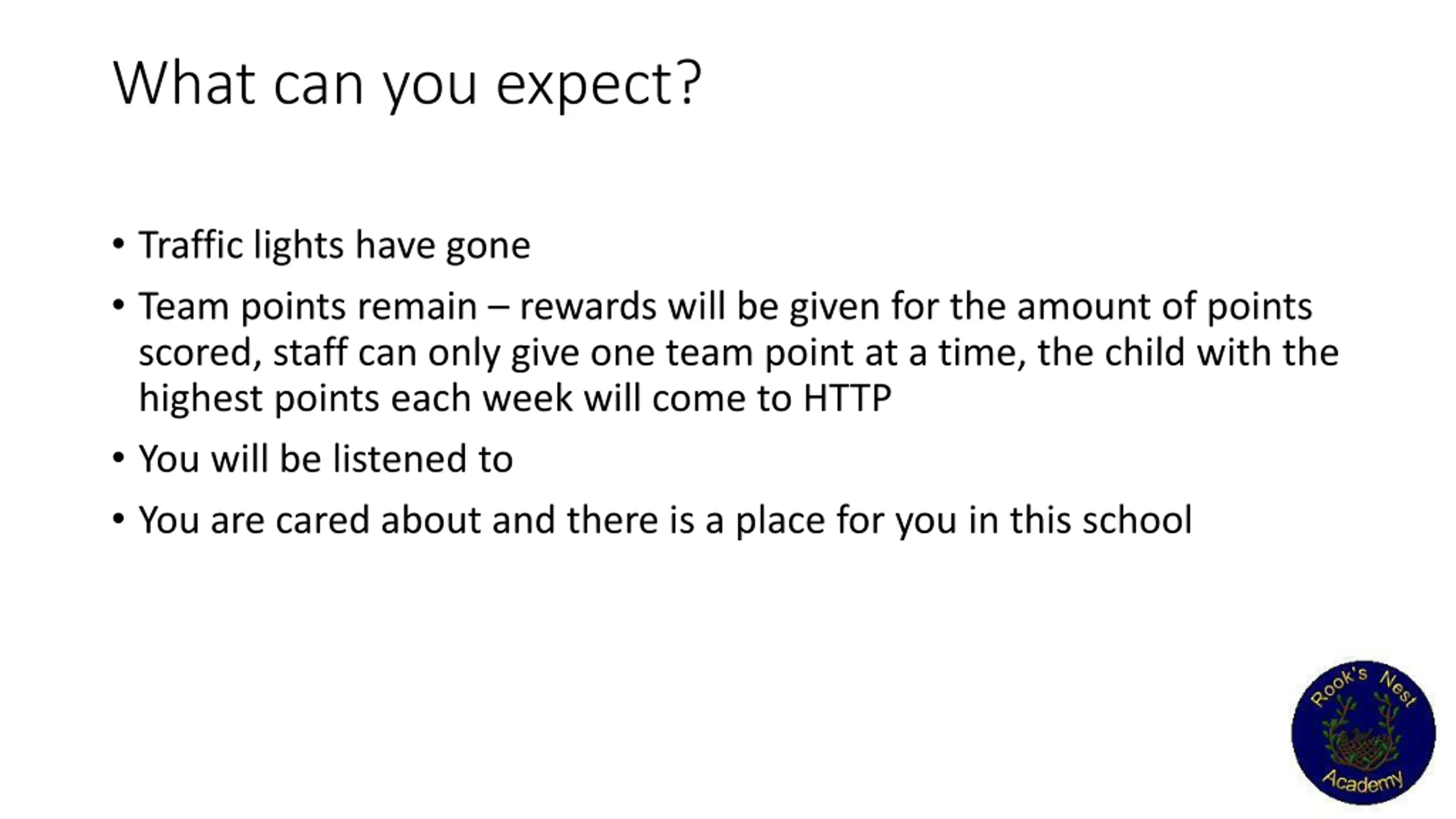 What can you expect? Traffic lights have gone Team points remain rewards will be given for the amount of points scored, staff can only give one team point at a time, the child with the highest points each week will come to HTTP You will be listened to You are cared about and there is a place for you in this school