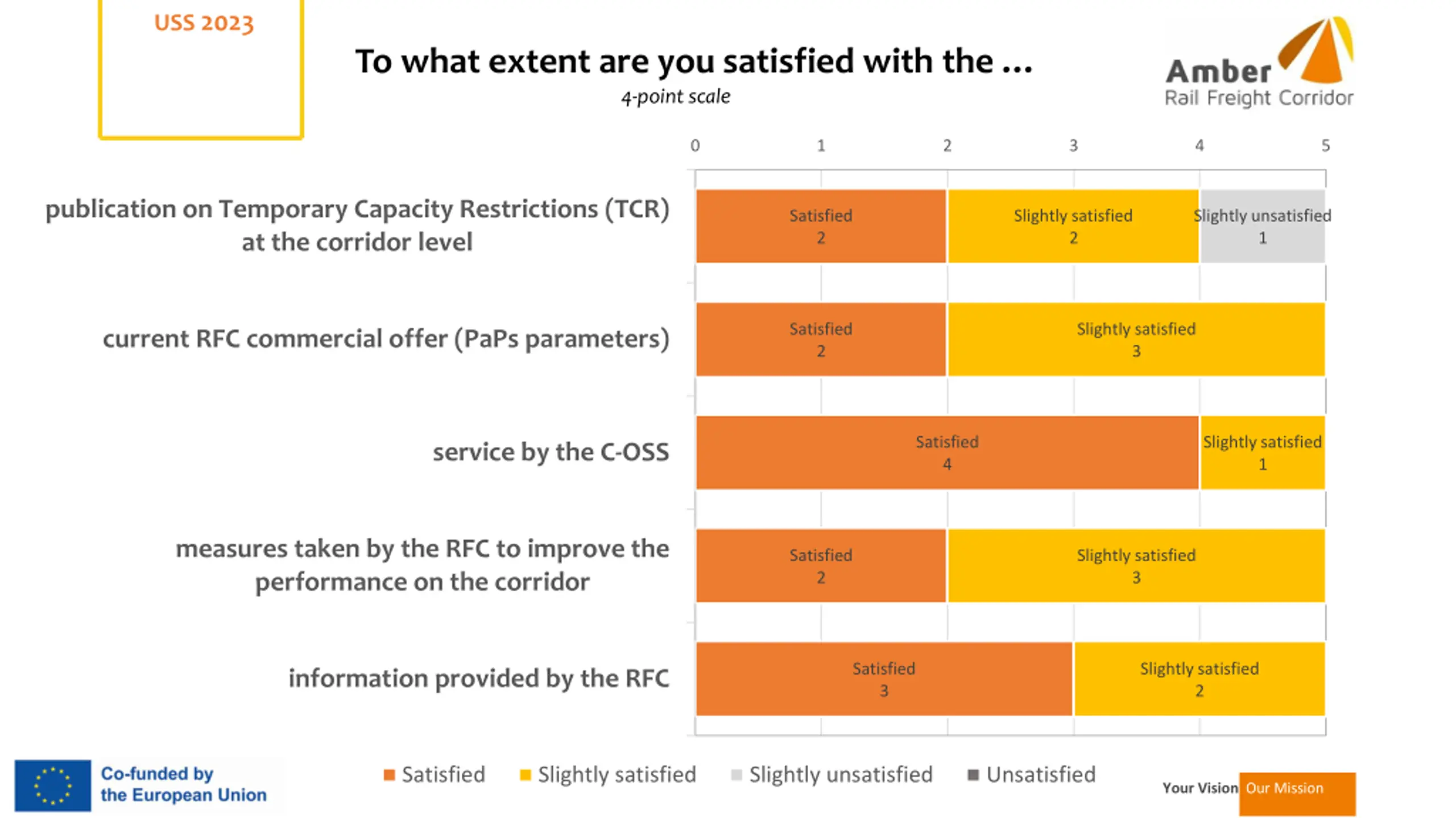 USS 2023 To what extent are you satisfied with the 4-point scale 0 1 2 3 4 5 publication on Temporary Capacity Restrictions (TCR) at the corridor level Satisfied 2 Slightly satisfied 2 Slightly unsatisfied 1 Satisfied 2 Slightly satisfied 3 current RFC commercial offer (PaPs parameters) Satisfied 4 Slightly satisfied 1 service by the C-OSS measures taken by the RFC to improve the performance on the corridor Satisfied 2 Slightly satisfied 3 Satisfied 3 Slightly satisfied 2 information provided by the RFC Satisfied Slightly satisfied Slightly unsatisfied Unsatisfied Your Vision Our Mission