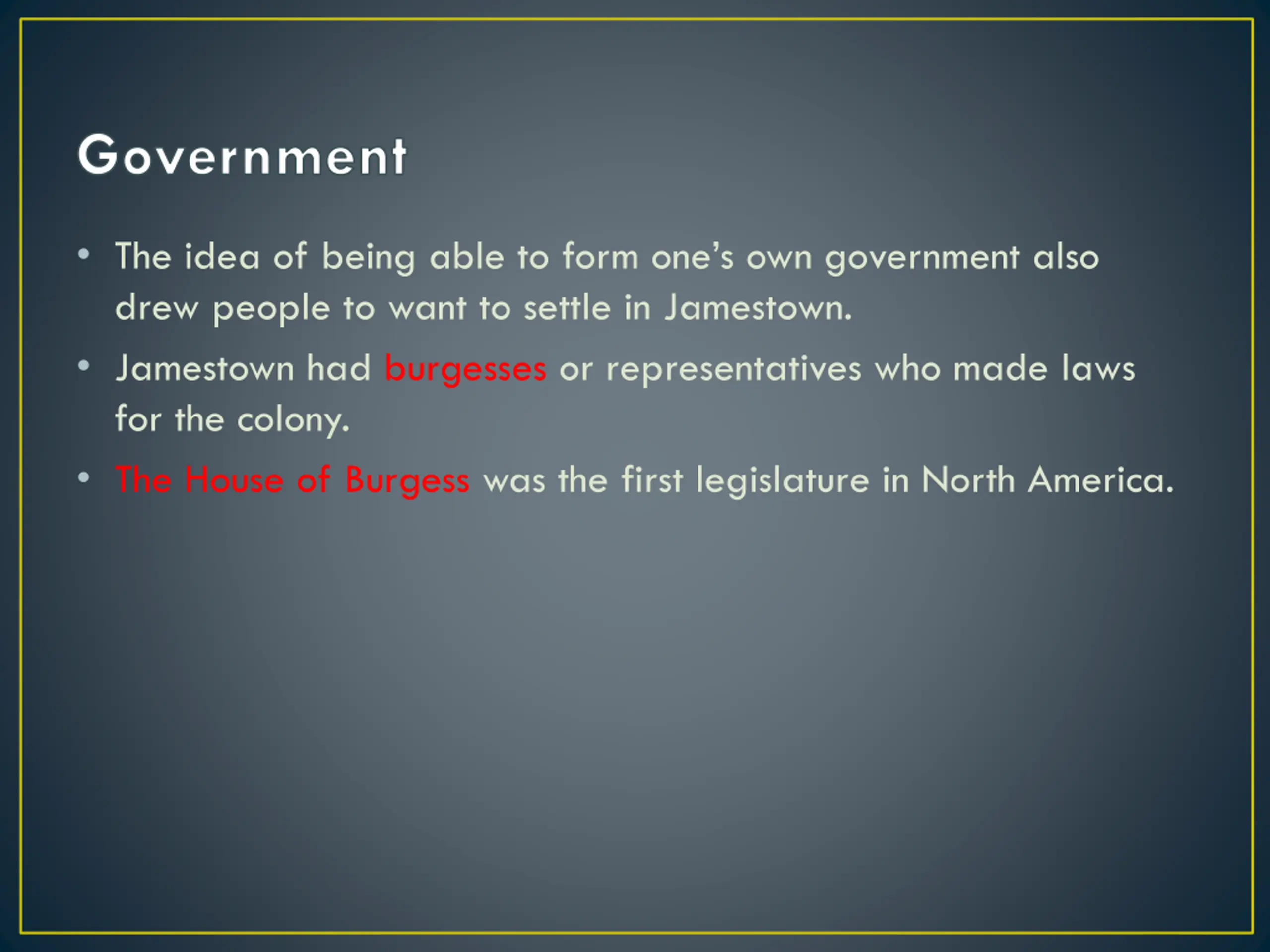 Government The idea of being able to form one s own government also drew people to want to settle in Jamestown. Jamestown had burgesses or representatives who made laws for the colony. The House of Burgess was the first legislature in North America.