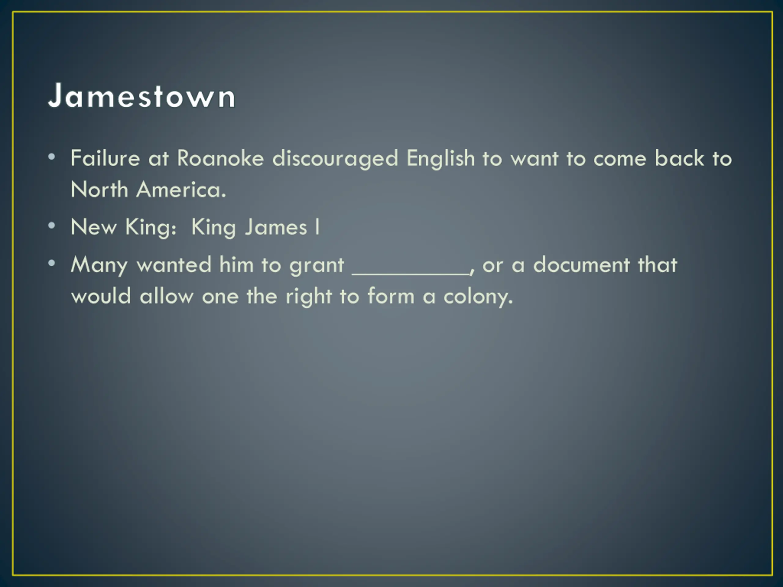 Jamestown Failure at Roanoke discouraged English to want to come back to North America. New King: King James I Many wanted him to grant _________, or a document that would allow one the right to form a colony.