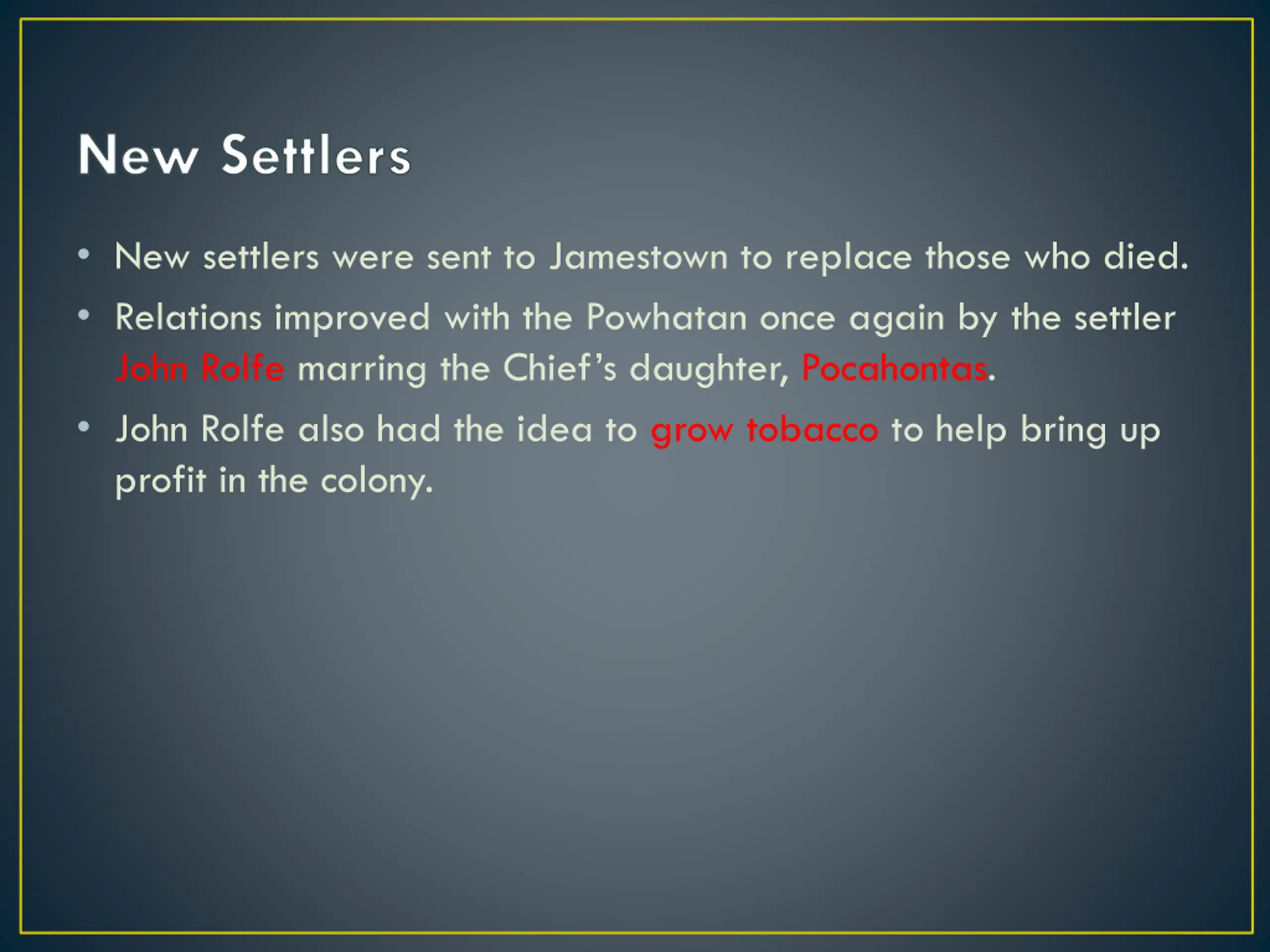 New Settlers New settlers were sent to Jamestown to replace those who died. Relations improved with the Powhatan once again by the settler John Rolfe marring the Chief s daughter, Pocahontas. John Rolfe also had the idea to grow tobacco to help bring up profit in the colony.