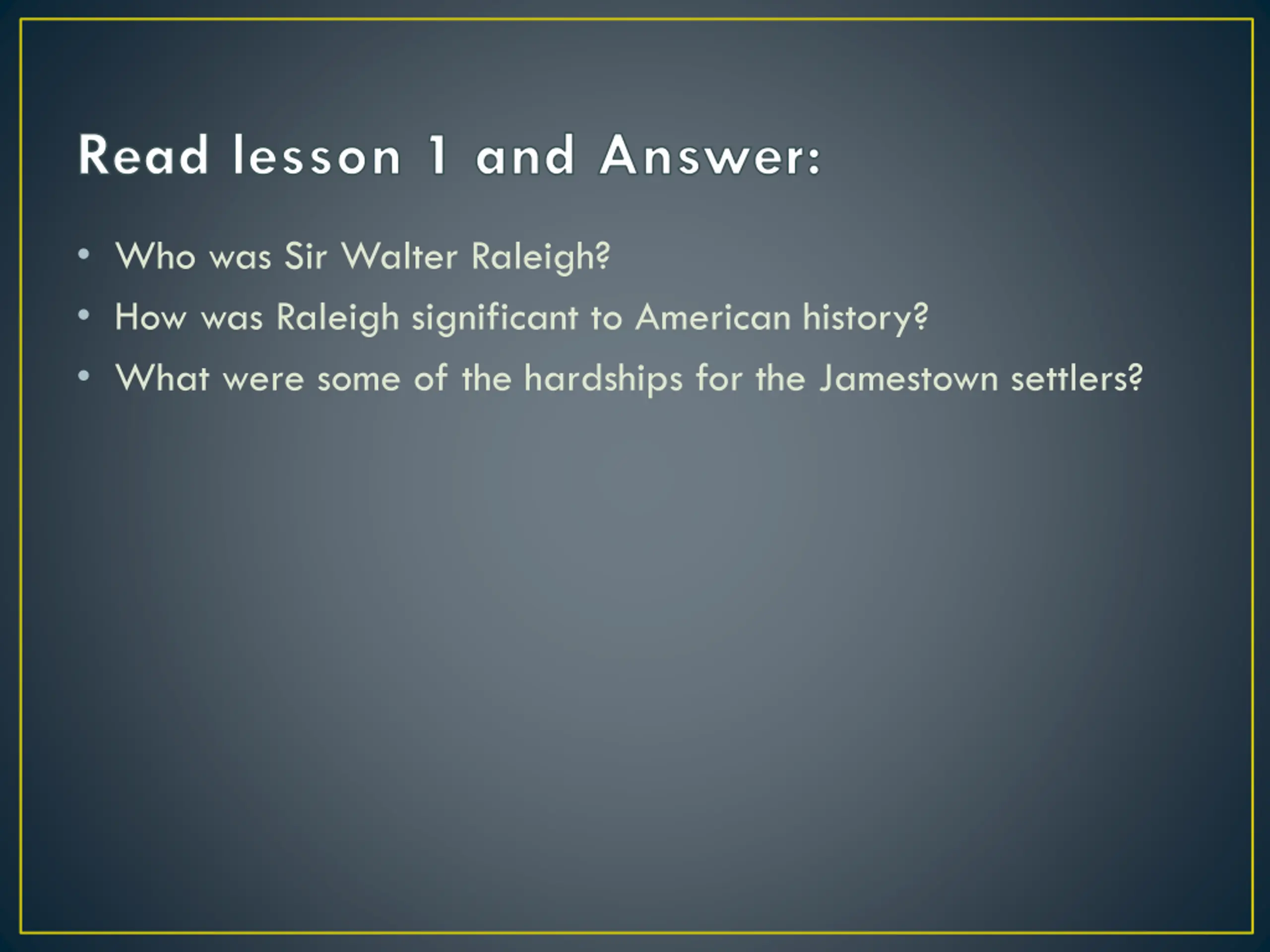 Read lesson 1 and Answer: Who was Sir Walter Raleigh? How was Raleigh significant to American history? What were some of the hardships for the Jamestown settlers?