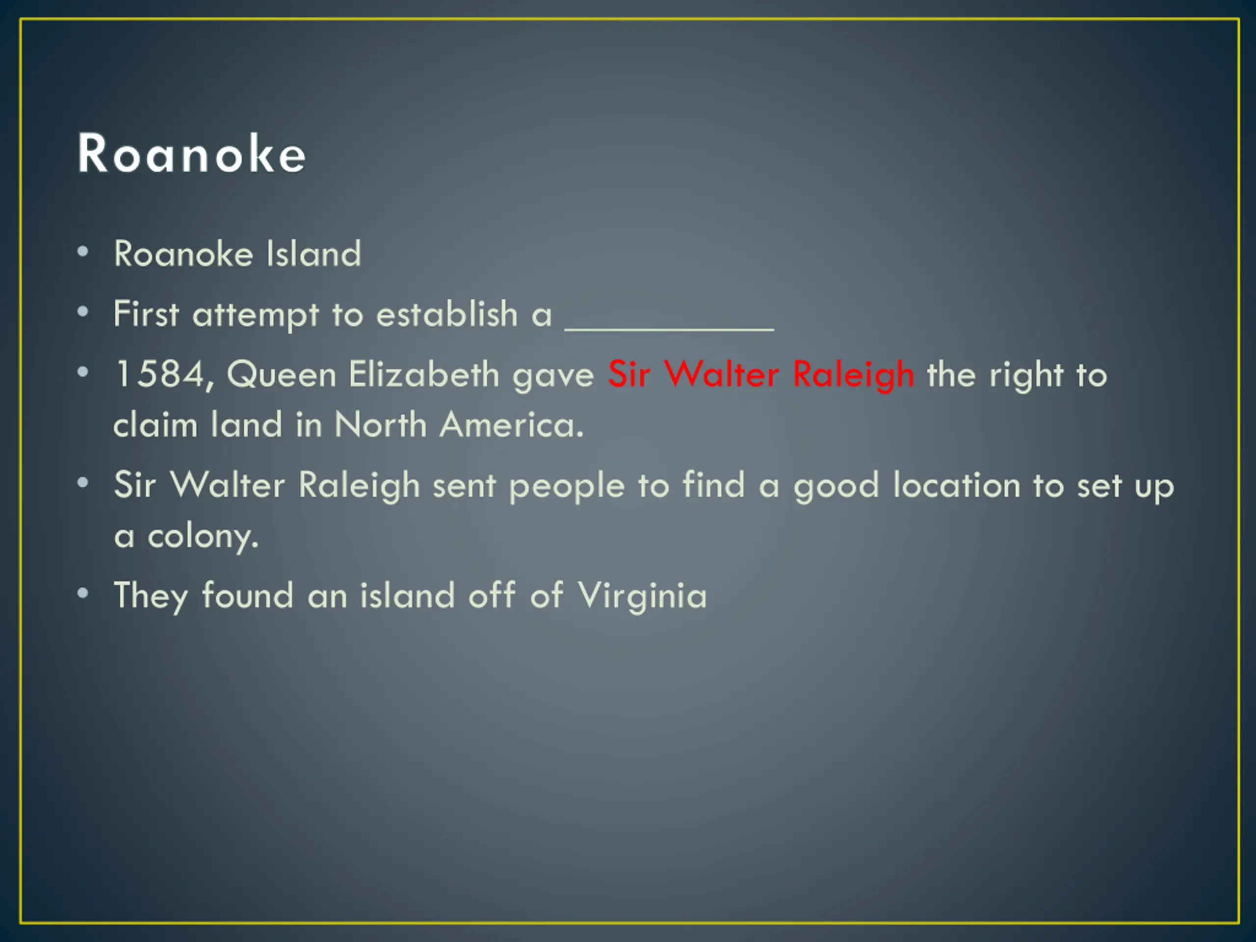 Roanoke Roanoke Island First attempt to establish a __________ 1584, Queen Elizabeth gave Sir Walter Raleigh the right to claim land in North America. Sir Walter Raleigh sent people to find a good location to set up a colony. They found an island off of Virginia