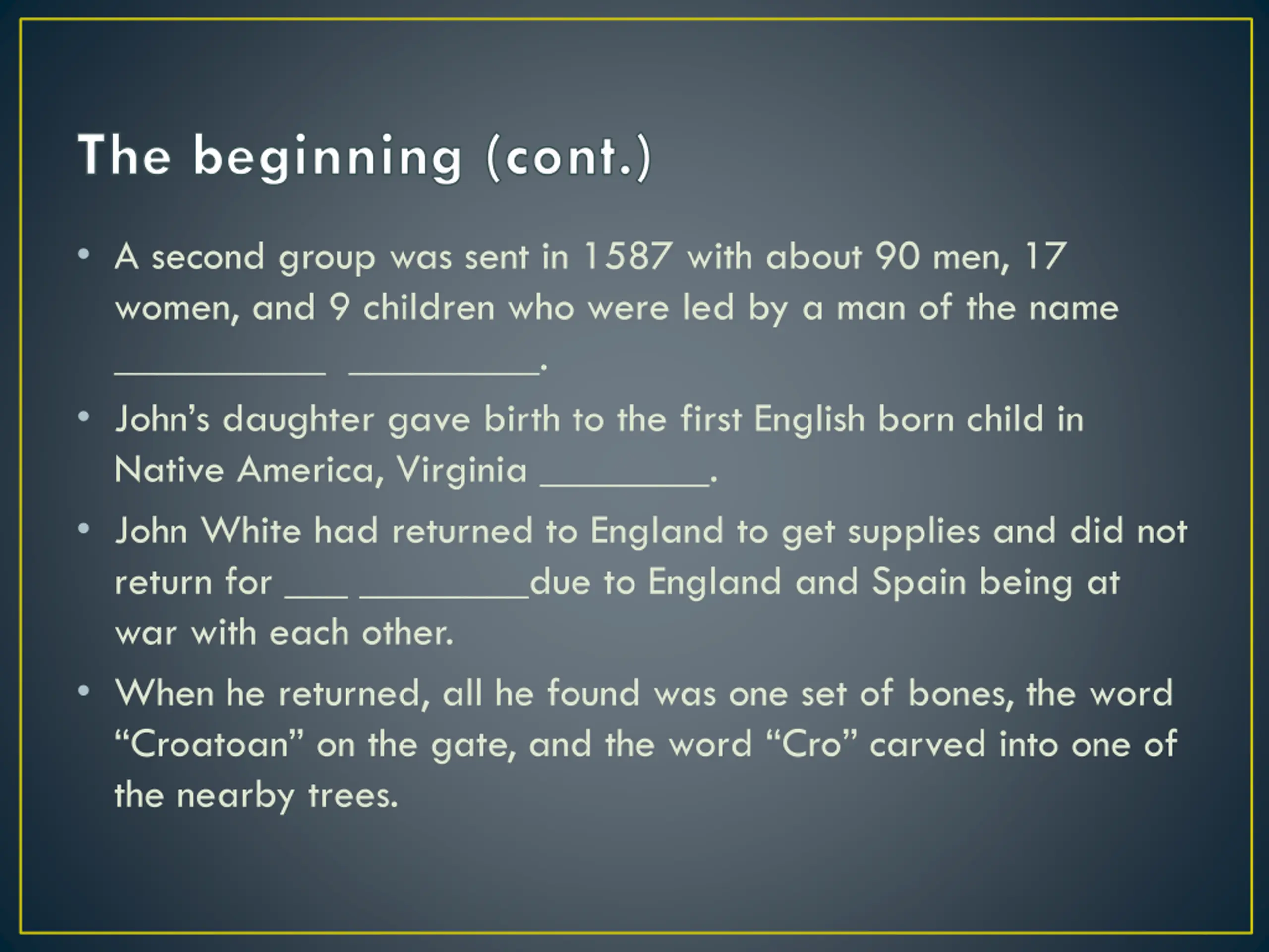 The beginning (cont.) A second group was sent in 1587 with about 90 men, 17 women, and 9 children who were led by a man of the name __________ _________. John s daughter gave birth to the first English born child in Native America, Virginia ________. John White had returned to England to get supplies and did not return for ___ ________due to England and Spain being at war with each other. When he returned, all he found was one set of bones, the word Croatoan on the gate, and the word Cro carved into one of the nearby trees.