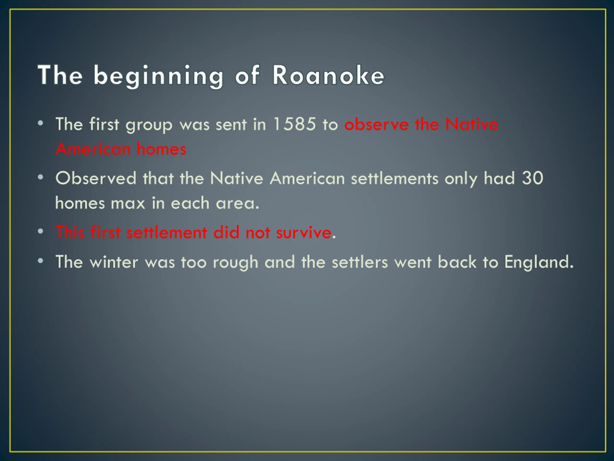 The beginning of Roanoke The first group was sent in 1585 to observe the Native American homes Observed that the Native American settlements only had 30 homes max in each area. This first settlement did not survive. The winter was too rough and the settlers went back to England.