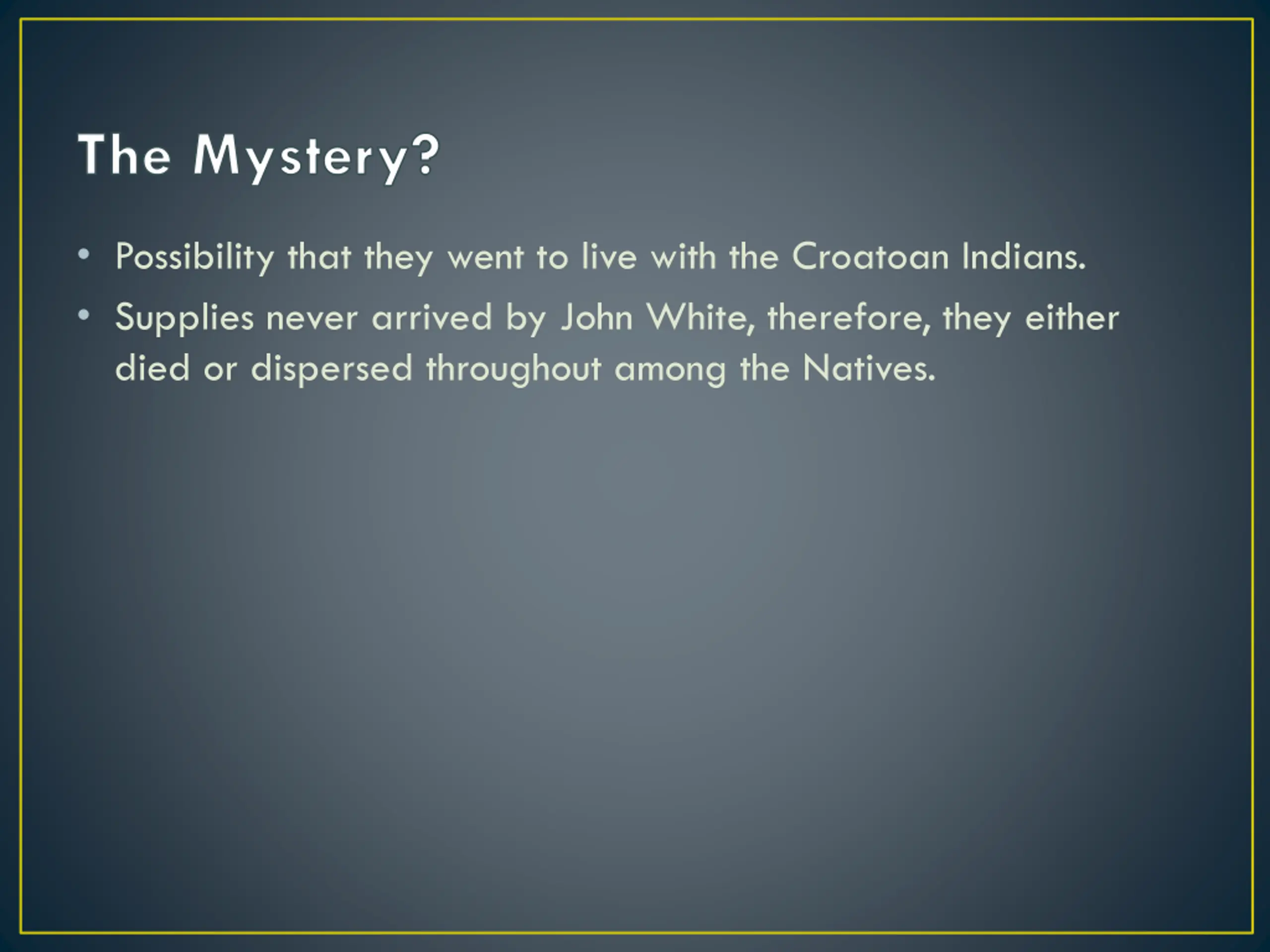 The Mystery? Possibility that they went to live with the Croatoan Indians. Supplies never arrived by John White, therefore, they either died or dispersed throughout among the Natives.