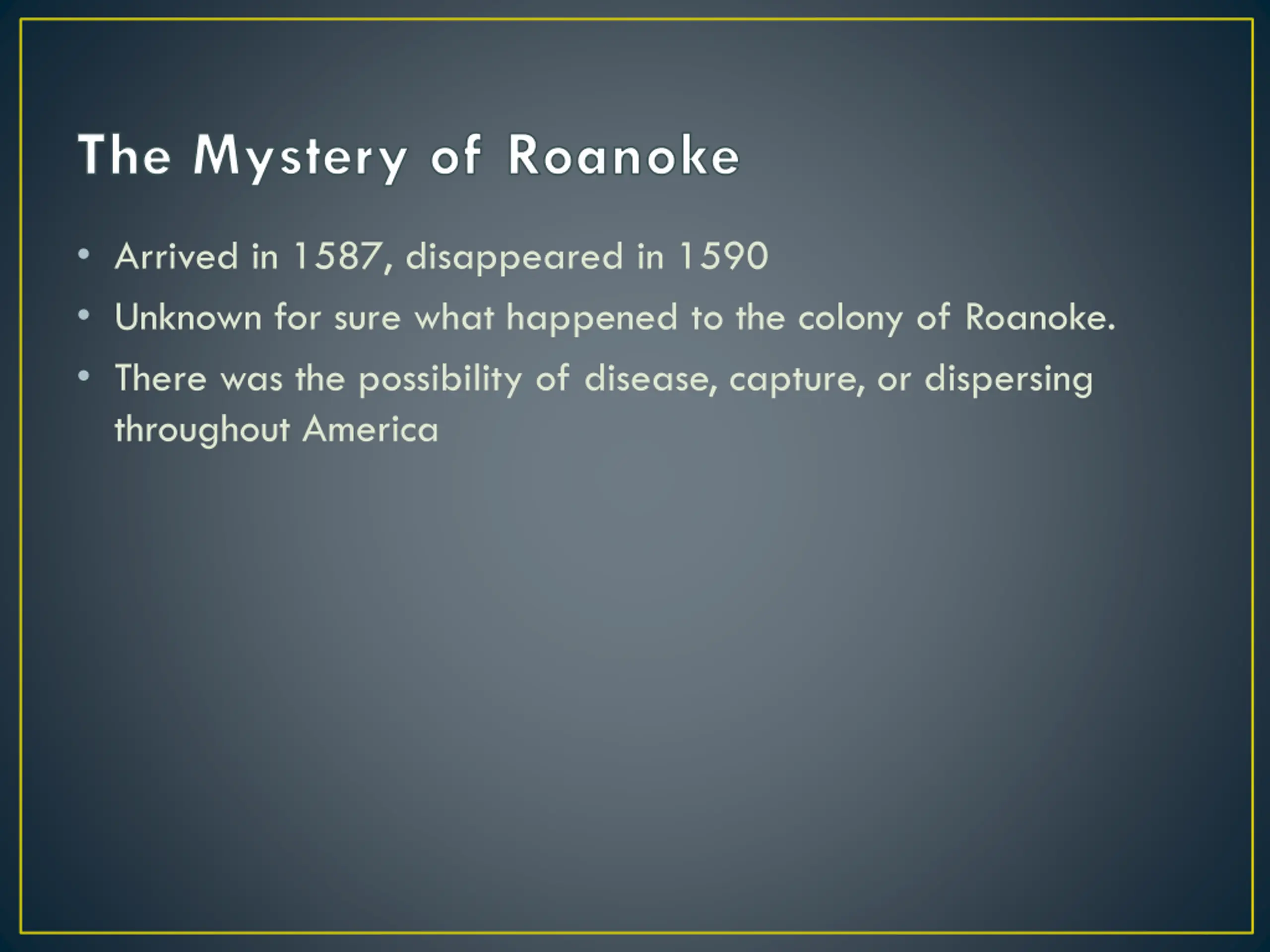 The Mystery of Roanoke Arrived in 1587, disappeared in 1590 Unknown for sure what happened to the colony of Roanoke. There was the possibility of disease, capture, or dispersing throughout America