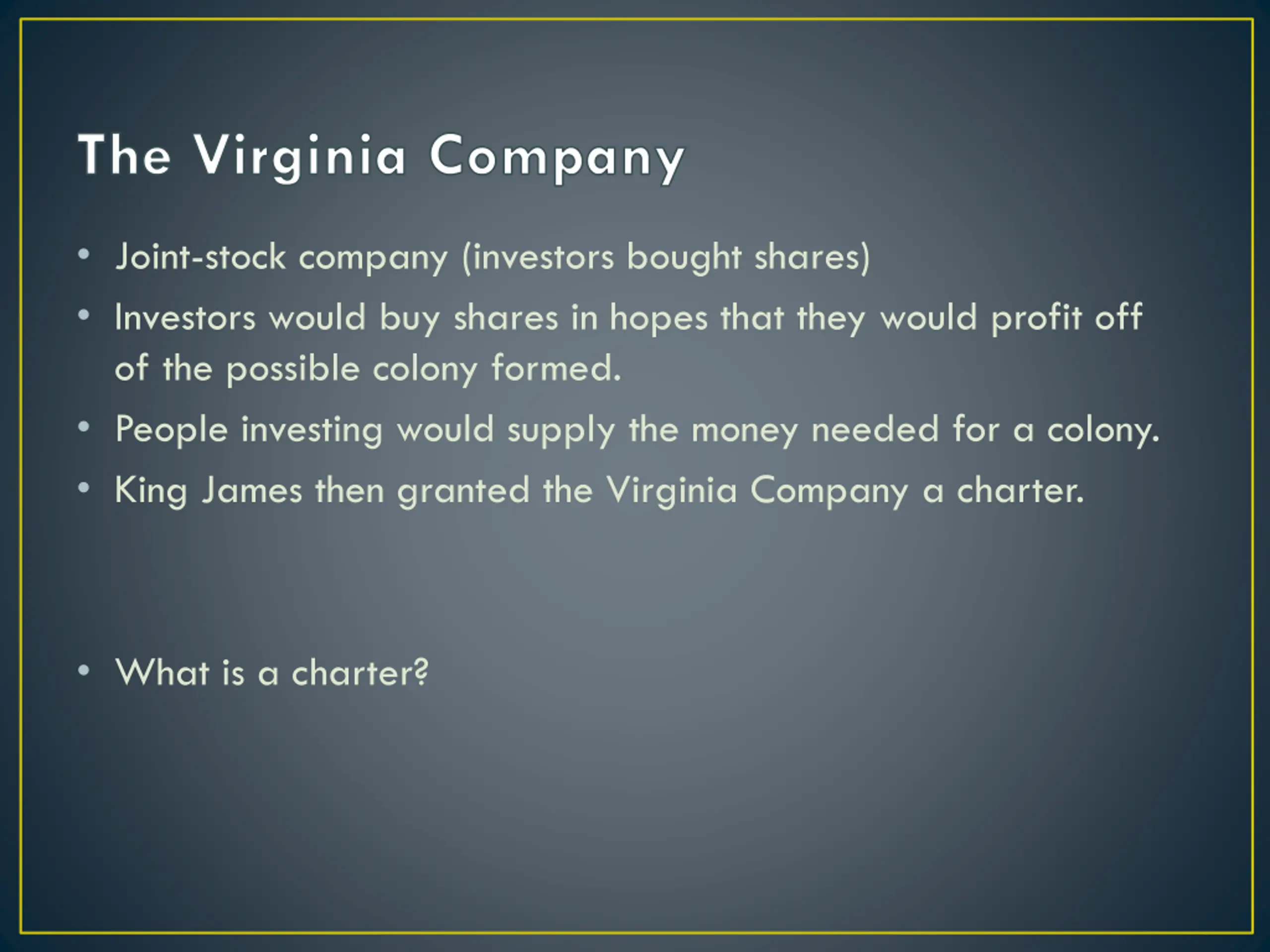 The Virginia Company Joint-stock company (investors bought shares) Investors would buy shares in hopes that they would profit off of the possible colony formed. People investing would supply the money needed for a colony. King James then granted the Virginia Company a charter. What is a charter?
