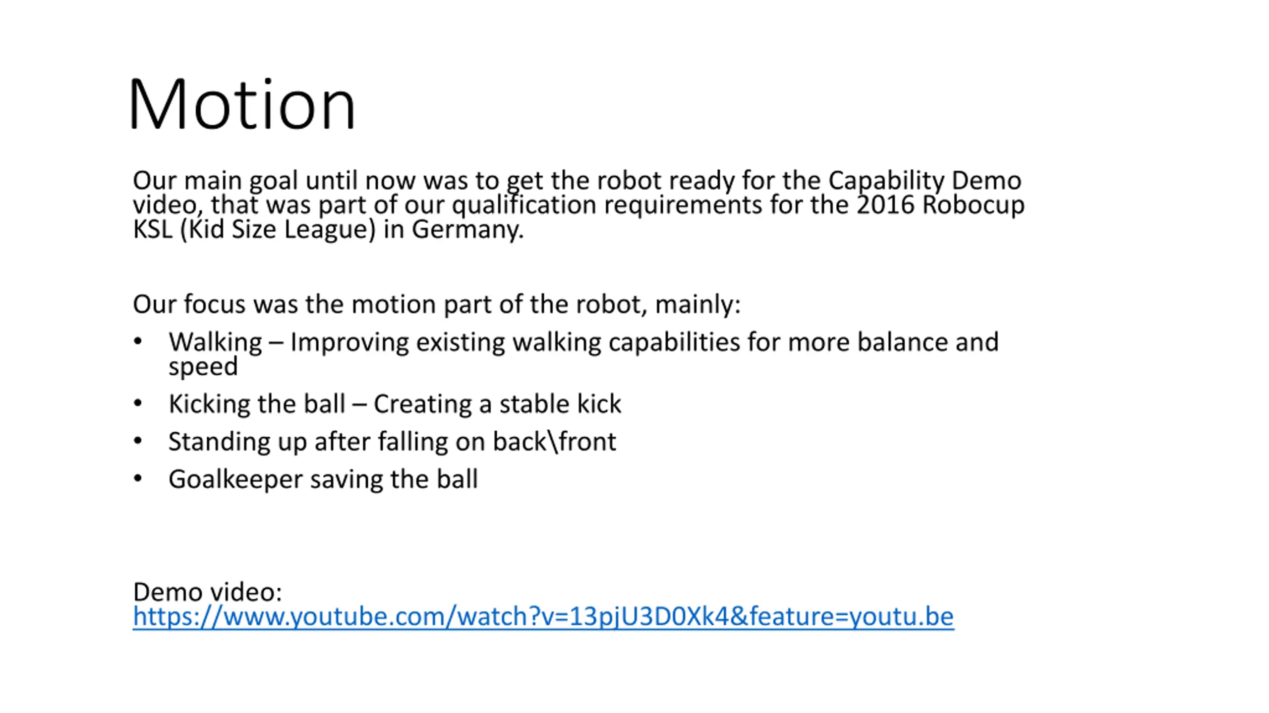 Motion Our main goal until now was to get the robot ready for the Capability Demo video, that was part of our qualification requirements for the 2016 Robocup KSL (Kid Size League) in Germany. Our focus was the motion part of the robot, mainly: Walking Improving existing walking capabilities for more balance and speed Kicking the ball Creating a stable kick Standing up after falling on back\front Goalkeeper saving the ball Demo video: https://www.youtube.com/watch?v=13pjU3D0Xk4&feature=youtu.be