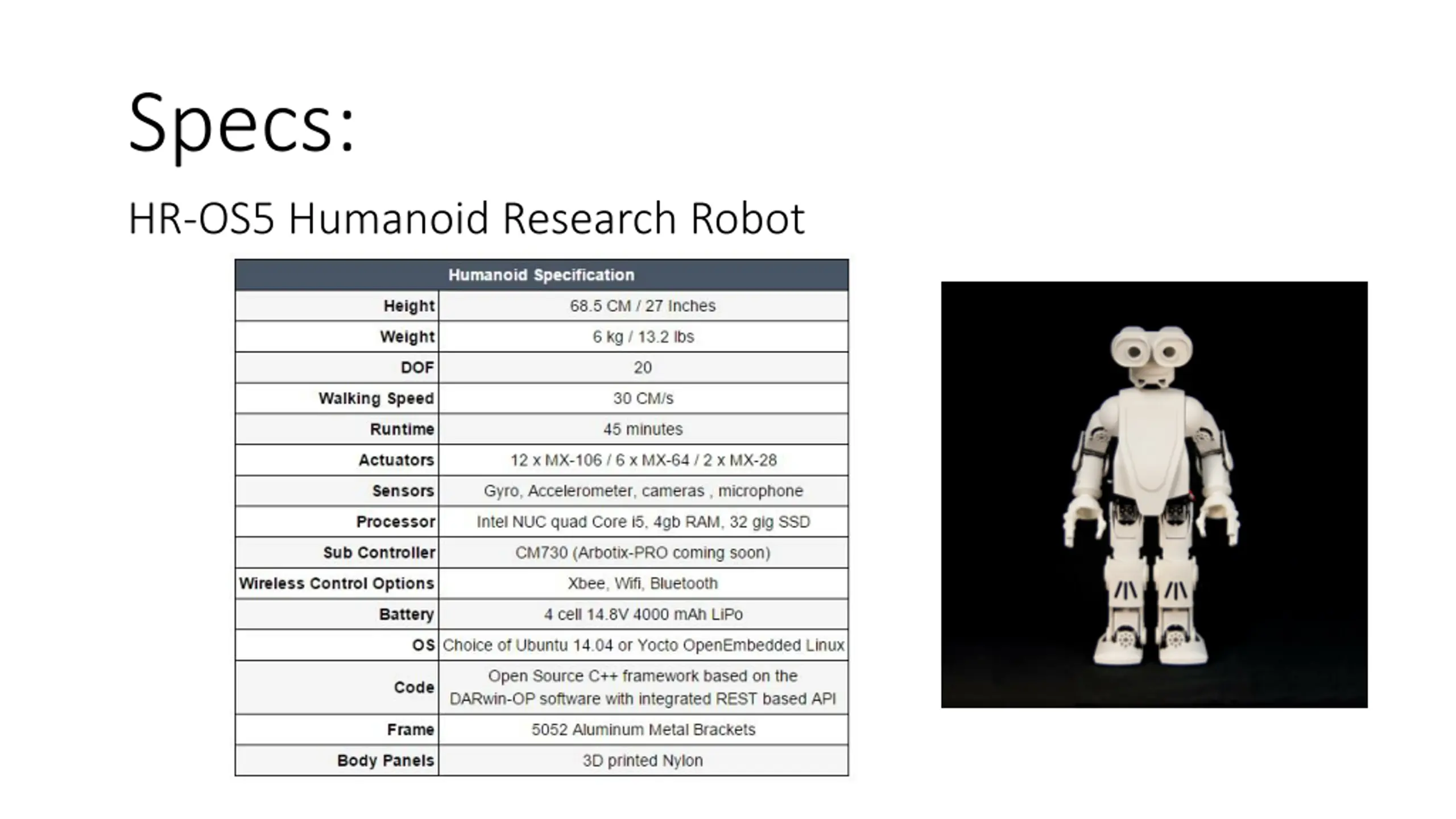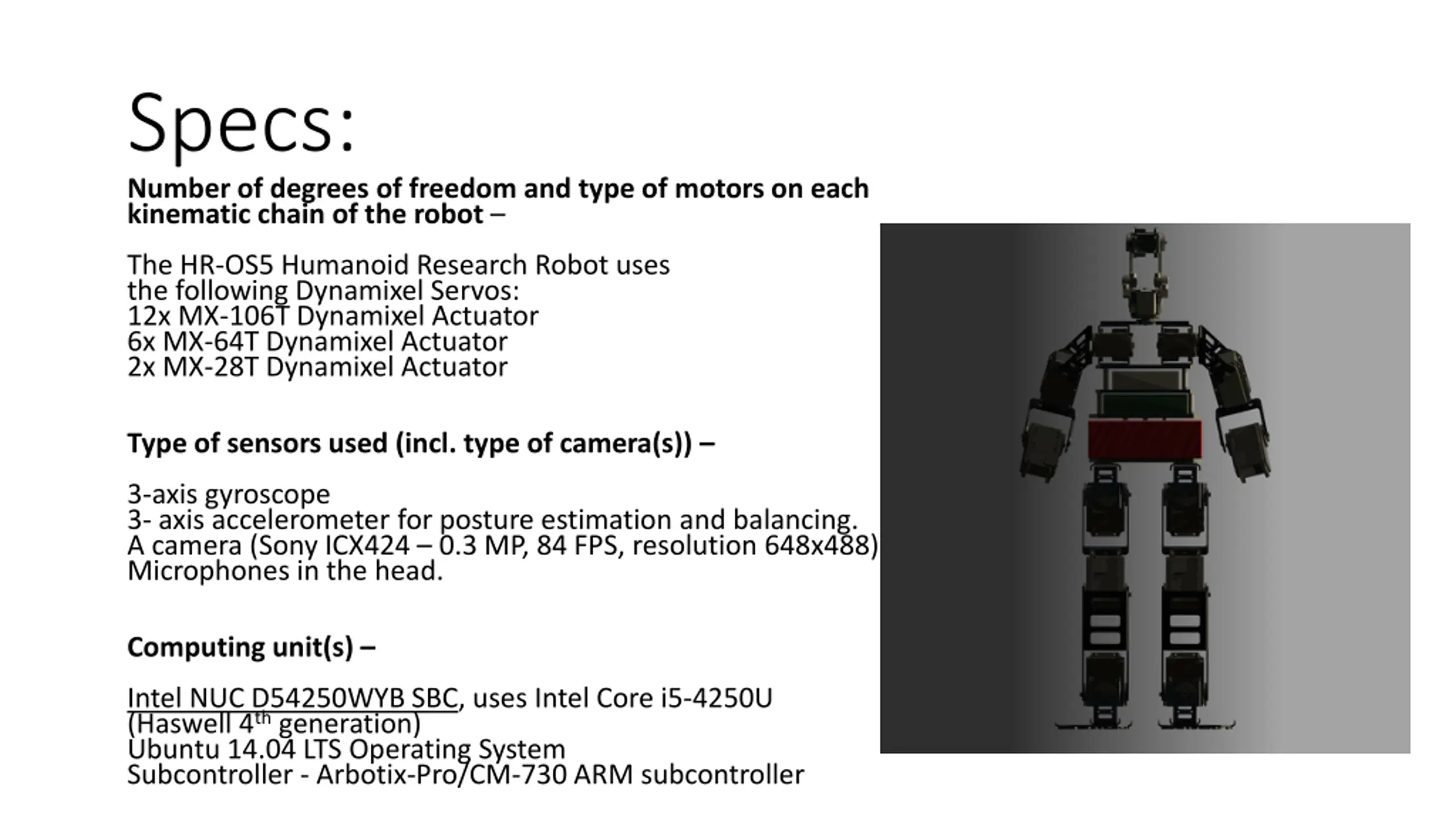 Specs: Number of degrees of freedom and type of motors on each kinematic chain of the robot The HR-OS5 Humanoid Research Robot uses the following Dynamixel Servos: 12x MX-106T Dynamixel Actuator 6x MX-64T Dynamixel Actuator 2x MX-28T Dynamixel Actuator Type of sensors used (incl. type of camera(s)) 3-axis gyroscope 3- axis accelerometer for posture estimation and balancing. A camera (Sony ICX424 0.3 MP, 84 FPS, resolution 648x488) Microphones in the head. Computing unit(s) Intel NUC D54250WYB SBC, uses Intel Core i5-4250U (Haswell 4th generation) Ubuntu 14.04 LTS Operating System Subcontroller - Arbotix-Pro/CM-730 ARM subcontroller