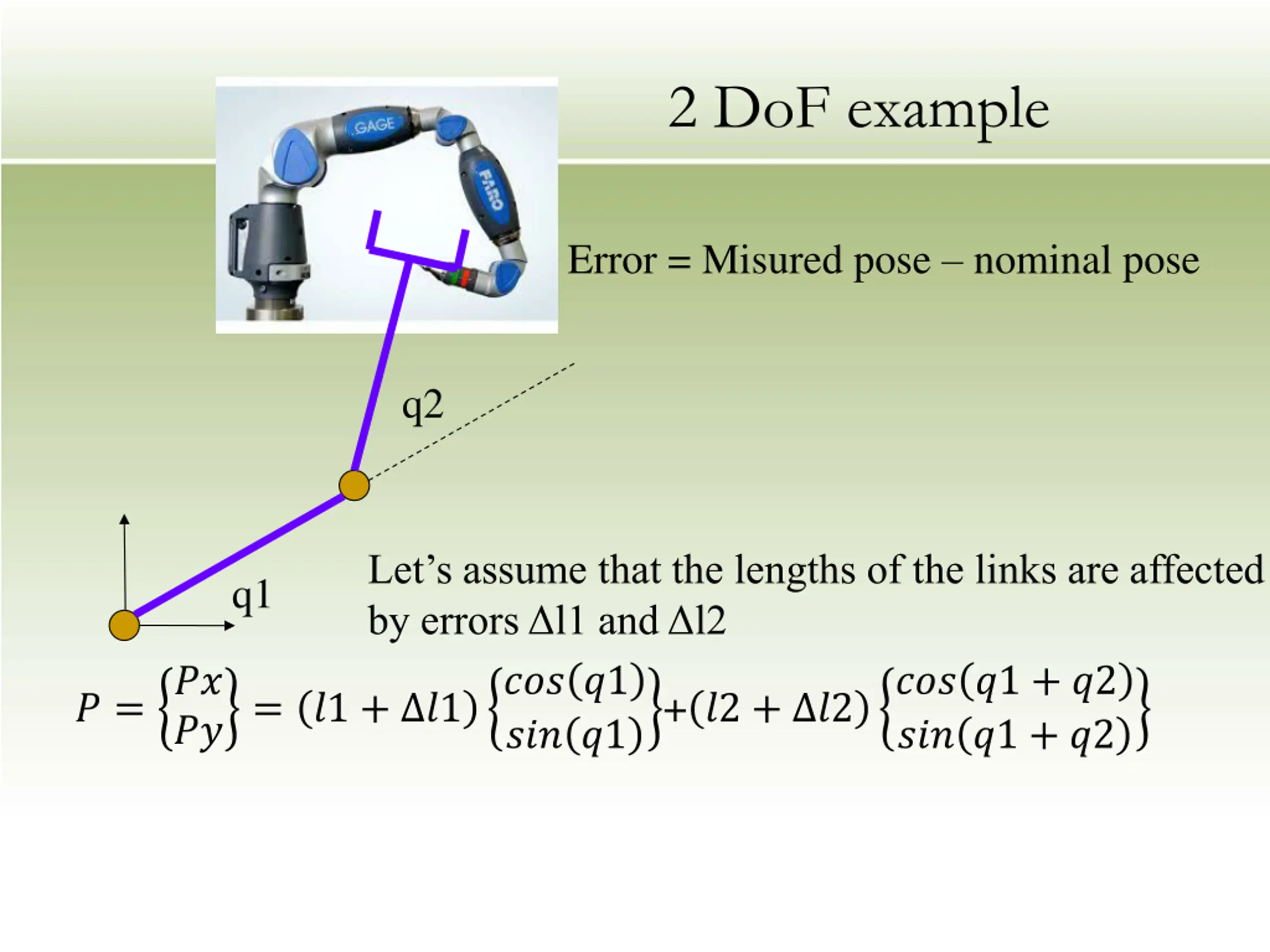 2 DoF example Error = Misured pose nominal pose q2 Let s assume that the lengths of the links are affected by errors l1 and l2 ??? ?1 ??? ?1 q1 ??? ?1 + ?2 ??? ?1 + ?2 ?? ??= ?1 + ?1 + ?2 + ?2 ? =