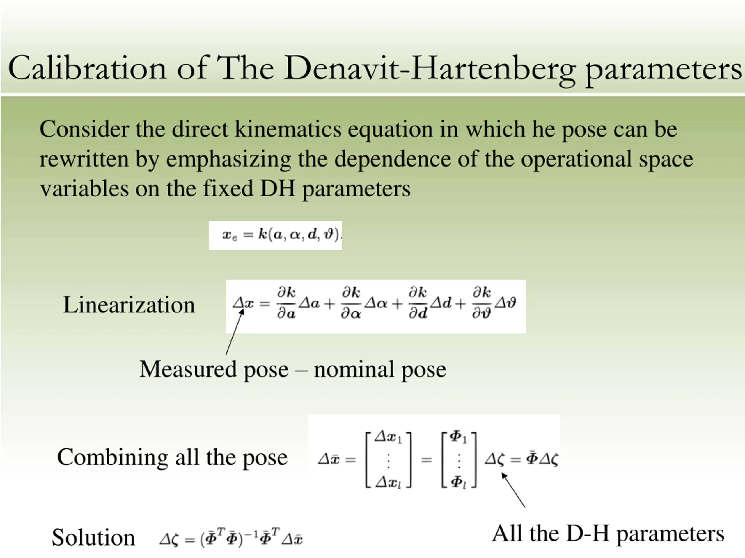 Calibration of The Denavit-Hartenberg parameters Consider the direct kinematics equation in which he pose can be rewritten by emphasizing the dependence of the operational space variables on the fixed DH parameters Linearization Measured pose nominal pose Combining all the pose All the D-H parameters Solution