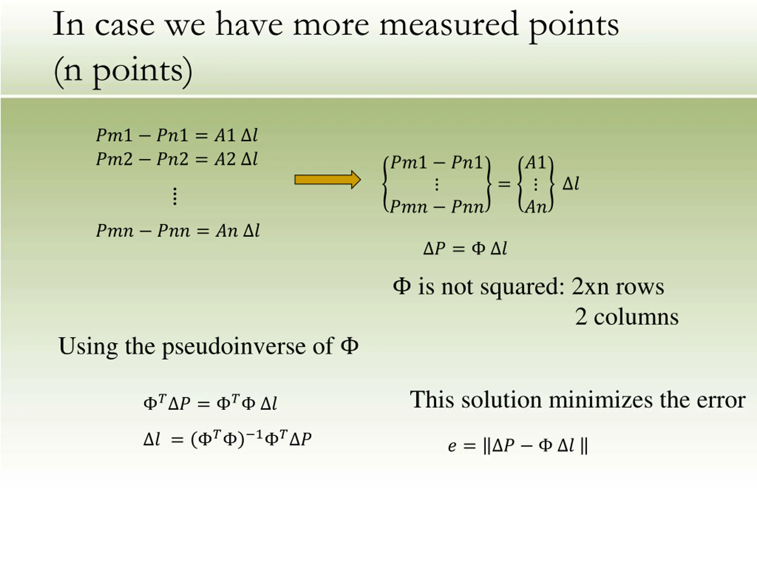 In case we have more measured points (n points) ??1 ??1 = ?1 ? ??2 ??2 = ?2 ? ??1 ??1 ??? ??? ?1 ?? = ? ??? ??? = ?? ? ? = ? is not squared: 2xn rows 2 columns Using the pseudoinverse of This solution minimizes the error ? ? = ? ? ?= ? 1 ? ? ? = ? ?