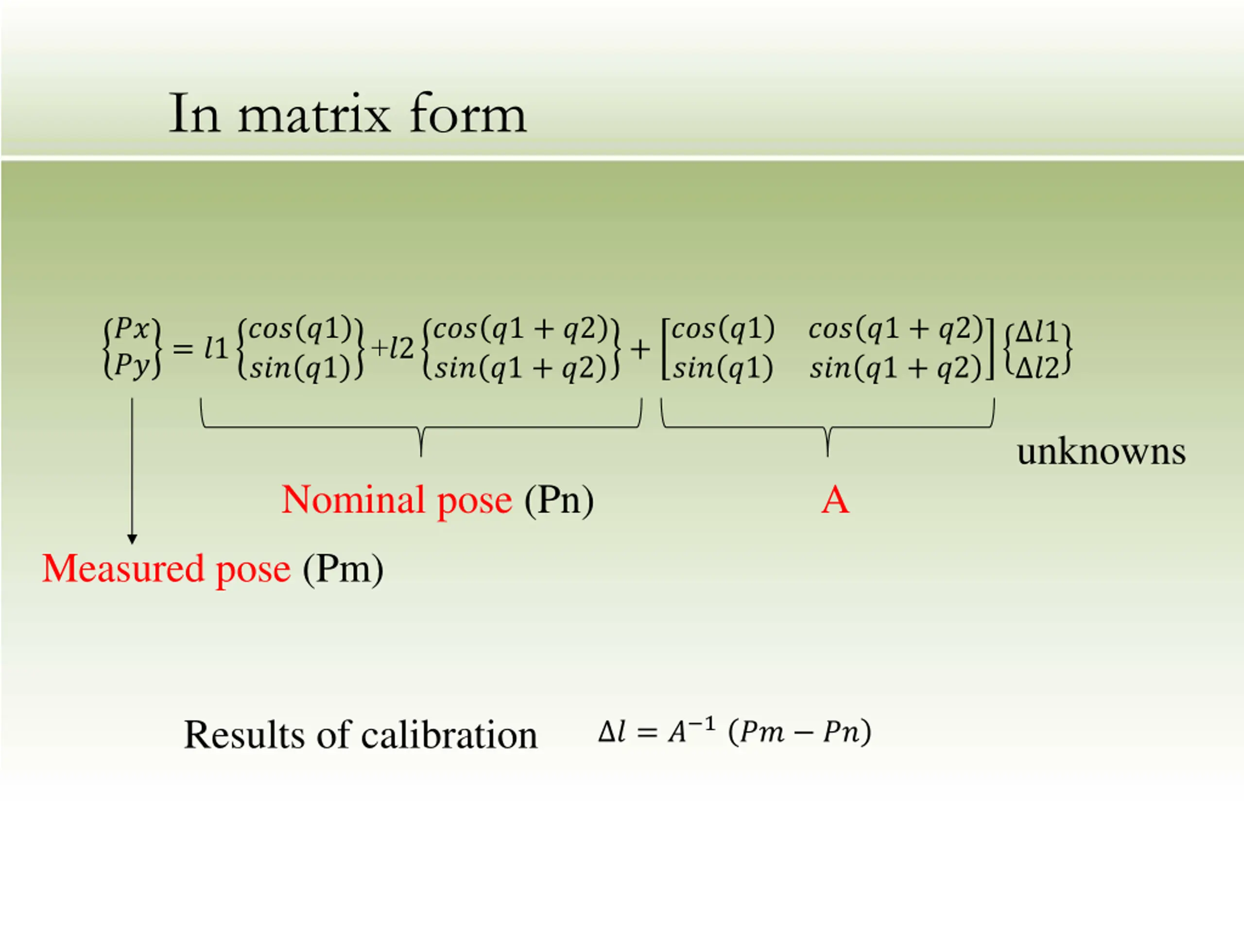 In matrix form ?? ??= ?1??? ?1 +?2??? ?1 + ?2 ??? ?1 + ?2 +??? ?1 ??? ?1 ??? ?1 + ?2 ??? ?1 + ?2 ?1 ?2 ??? ?1 unknowns Nominal pose (Pn) A Measured pose (Pm) Results of calibration ? = ? 1?? ??