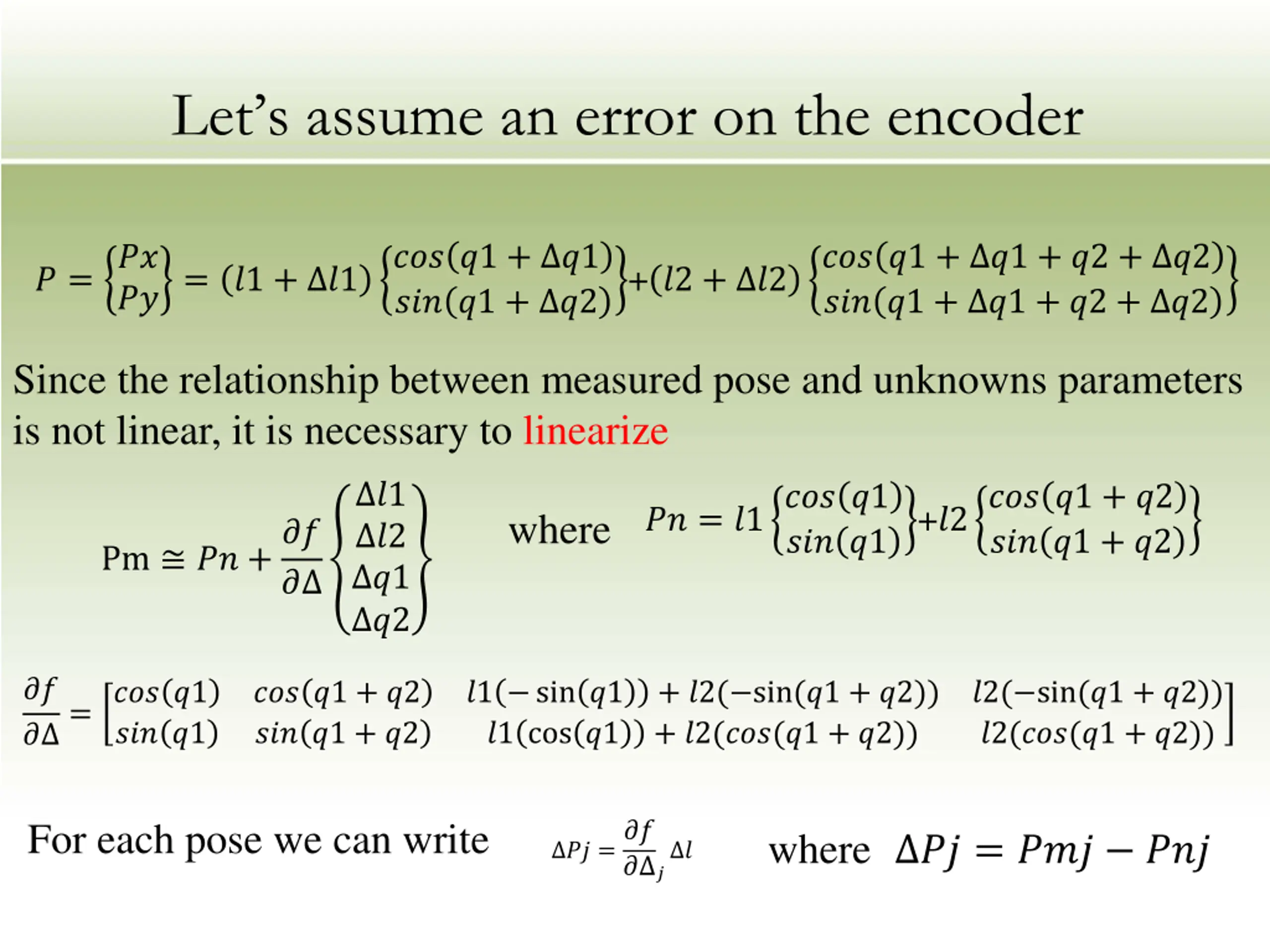 Lets assume an error on the encoder ??? ?1 + ?1 ??? ?1 + ?2 ??? ?1 + ?1 + ?2 + ?2 ??? ?1 + ?1 + ?2 + ?2 ?? ??= ?1 + ?1 + ?2 + ?2 ? = Since the relationship between measured pose and unknowns parameters is not linear, it is necessary to linearize ?1 ?2 ?1 ?2 ?? = ?1??? ?1 +?2??? ?1 + ?2 ??? ?1 + ?2 where Pm ?? +?? ??? ?1 ? ?? ? = ??? ?1 ??? ?1 ??? ?1 + ?2 ??? ?1 + ?2 ?1 sin ?1 ?1 cos ?1 + ?2( sin(?1 + ?2)) + ?2(???(?1 + ?2)) ?2( sin(?1 + ?2)) ?2(???(?1 + ?2)) For each pose we can write ?? =?? where ?? = ??? ??? ? ? ?