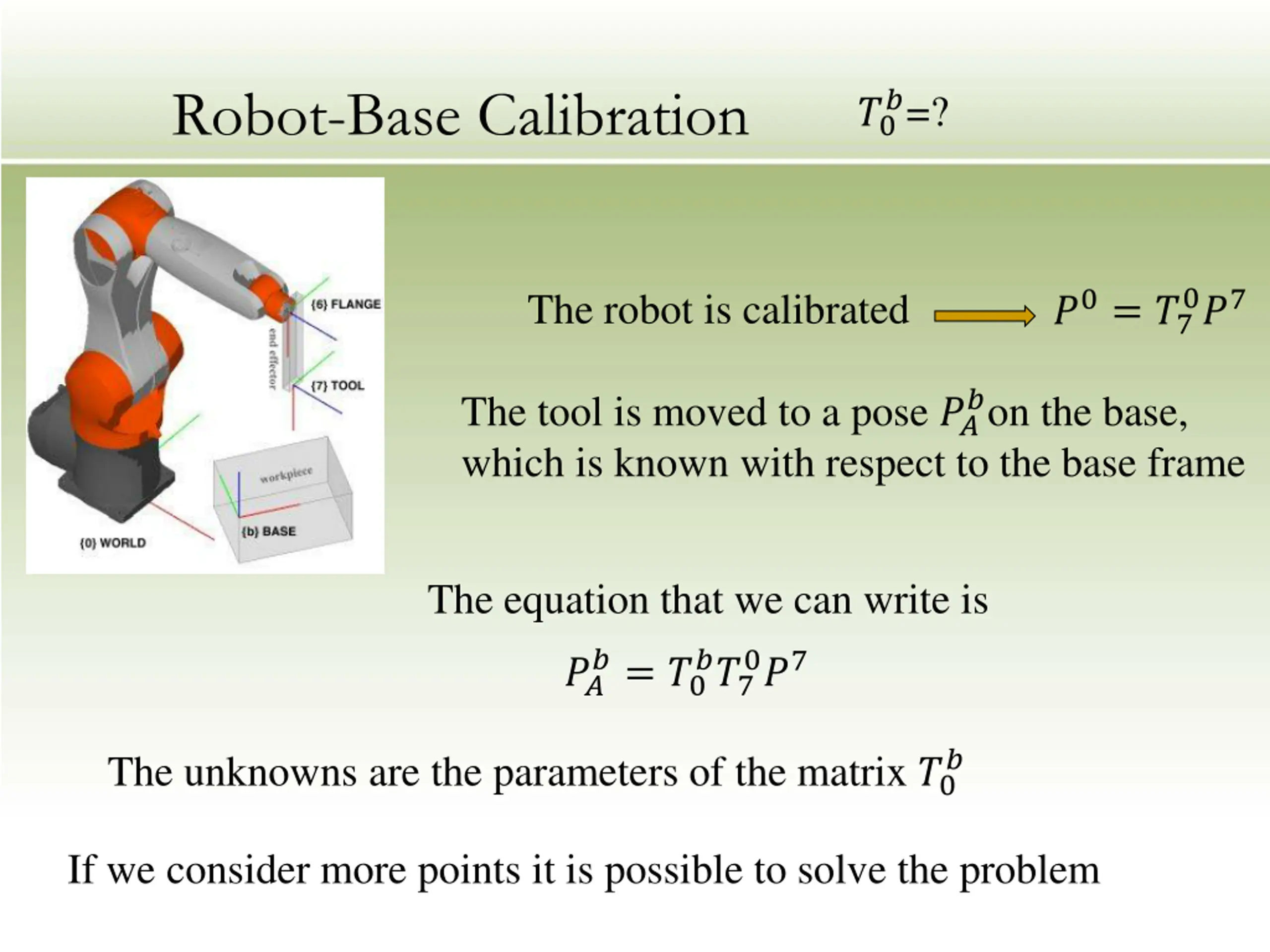 Robot-Base Calibration ?=? ?0 0?7 The robot is calibrated ?0= ?7 ?on the base, The tool is moved to a pose ?? which is known with respect to the base frame The equation that we can write is ?= ?0 ??7 0?7 ?? ? The unknowns are the parameters of the matrix ?0 If we consider more points it is possible to solve the problem