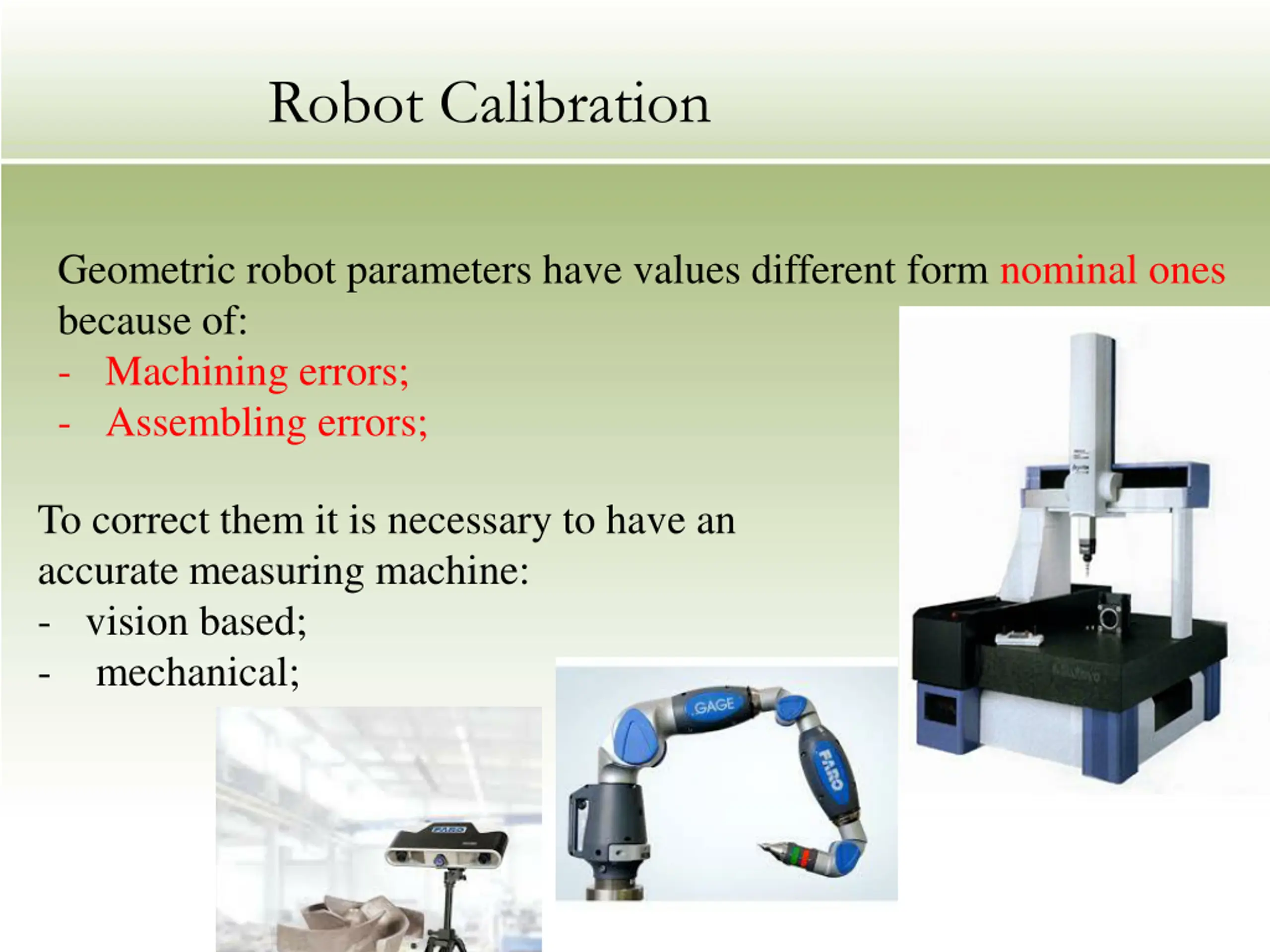 Robot Calibration Geometric robot parameters have values different form nominal ones because of: - Machining errors; - Assembling errors; To correct them it is necessary to have an accurate measuring machine: - vision based; - mechanical;