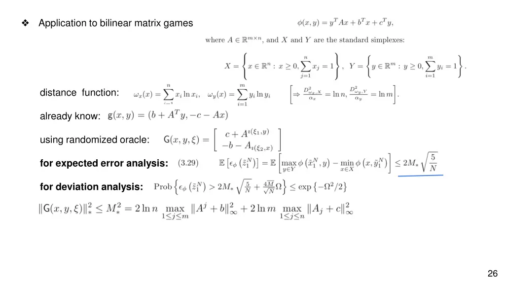 Application to bilinear matrix games distance function: already know: using randomized oracle: for expected error analysis: for deviation analysis: 26