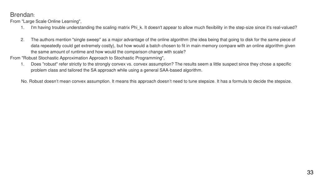Brendan: From "Large Scale Online Learning", 1. I'm having trouble understanding the scaling matrix Phi_k. It doesn't appear to allow much flexibility in the step-size since it's real-valued? The authors mention "single sweep" as a major advantage of the online algorithm (the idea being that going to disk for the same piece of data repeatedly could get extremely costly), but how would a batch chosen to fit in main memory compare with an online algorithm given the same amount of runtime and how would the comparison change with scale? From "Robust Stochastic Approximation Approach to Stochastic Programming", 1. Does "robust" refer strictly to the strongly convex vs. convex assumption? The results seem a little suspect since they chose a specific problem class and tailored the SA approach while using a general SAA-based algorithm. 2. No. Robust doesn t mean convex assumption. It means this approach doesn t need to tune stepsize. It has a formula to decide the stepsize. 33
