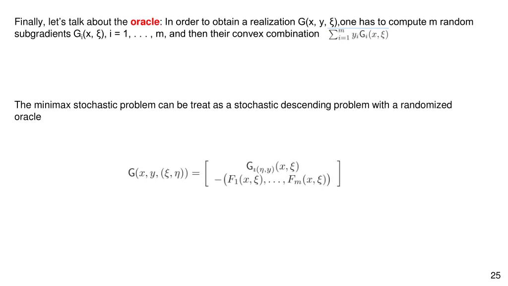Finally, lets talk about the oracle: In order to obtain a realization G(x, y, ),one has to compute m random subgradients Gi(x, ), i = 1, . . . , m, and then their convex combination The minimax stochastic problem can be treat as a stochastic descending problem with a randomized oracle 25