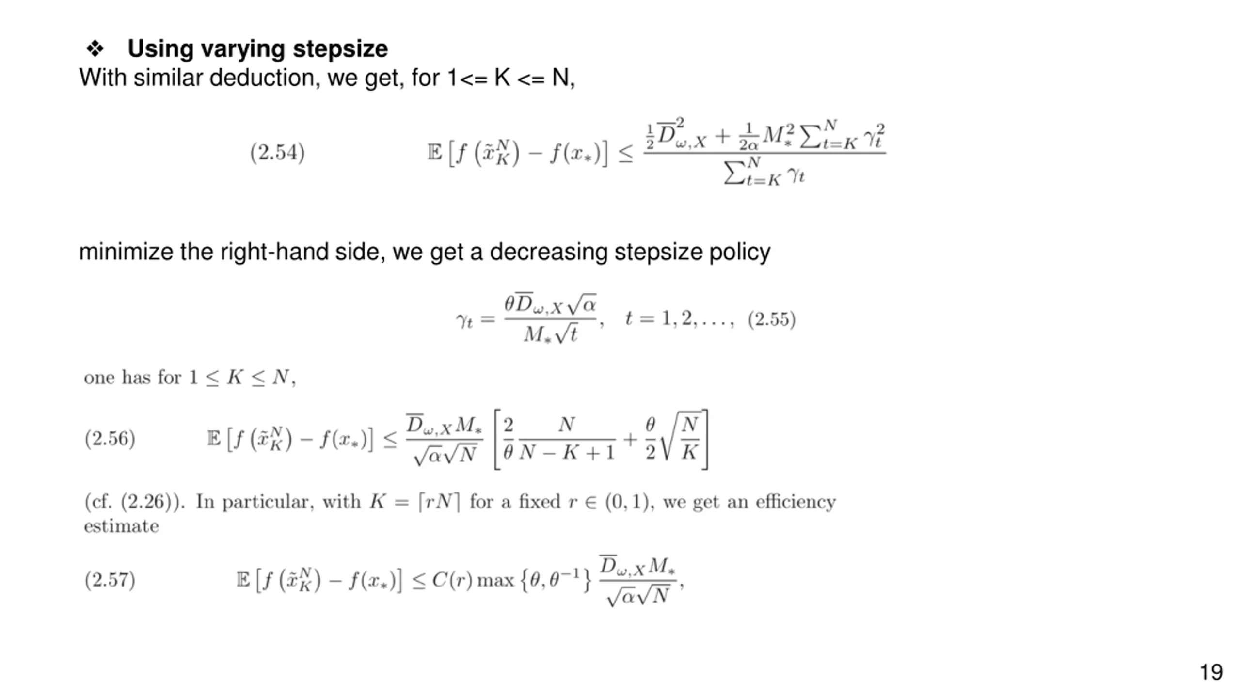 Using varying stepsize With similar deduction, we get, for 1<= K <= N, minimize the right-hand side, we get a decreasing stepsize policy 19