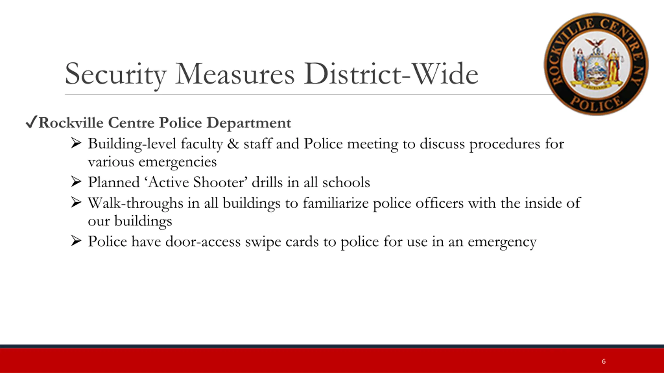 Security Measures District-Wide Rockville Centre Police Department most recent meeting, 9/8 Work collaboratively with the Rockville Centre Police Commissioner Police Executive Staff and Police Department Youth Officer work with Administrators to address specific needs Regular Police patrols of school campuses Share procedures including review of District-wide Emergency Response Plan by Commissioner Police are working to train all personnel on how to appropriately interact with Students with Disabilities 5