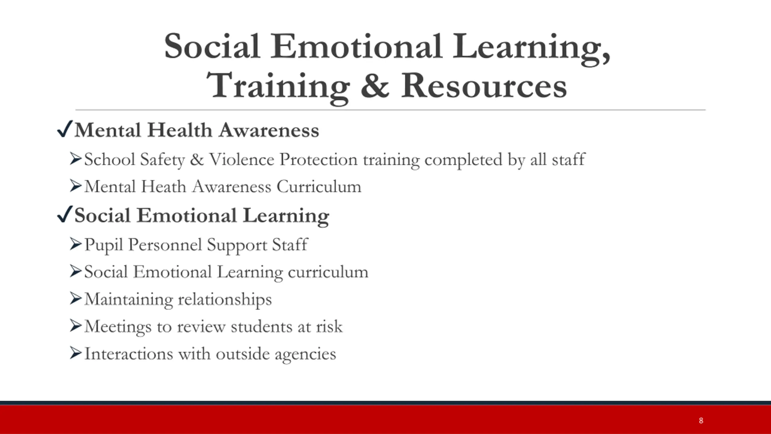 Social Emotional Learning, Training & Resources Mental Health Awareness School Safety & Violence Protection training completed by all staff Mental Heath Awareness Curriculum Social Emotional Learning Pupil Personnel Support Staff Social Emotional Learning curriculum Maintaining relationships Meetings to review students at risk Interactions with outside agencies 8