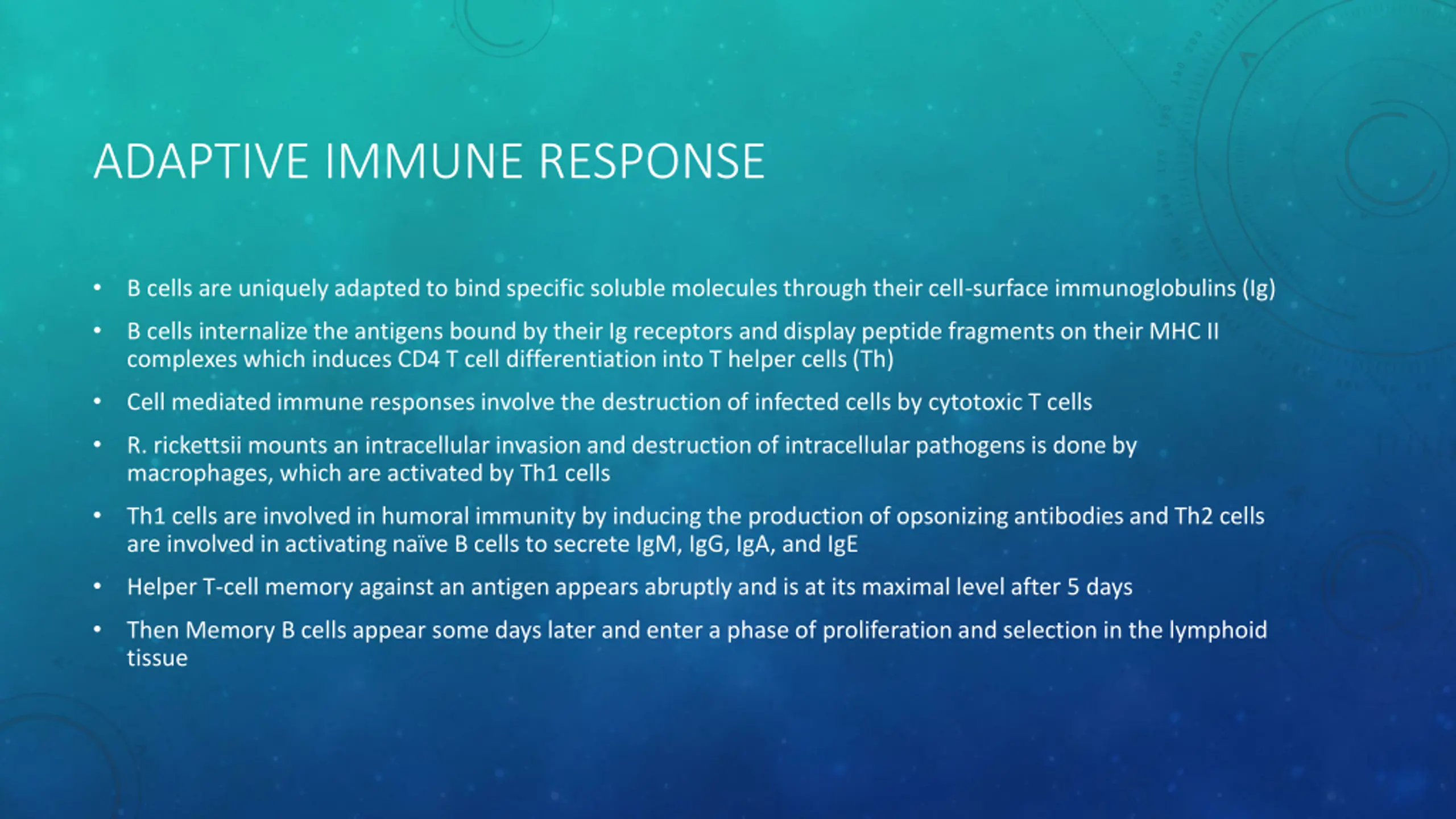 ADAPTIVE IMMUNE RESPONSE B cells are uniquely adapted to bind specific soluble molecules through their cell-surface immunoglobulins (Ig) B cells internalize the antigens bound by their Ig receptors and display peptide fragments on their MHC II complexes which induces CD4 T cell differentiation into T helper cells (Th) Cell mediated immune responses involve the destruction of infected cells by cytotoxic T cells R. rickettsii mounts an intracellular invasion and destruction of intracellular pathogens is done by macrophages, which are activated by Th1 cells Th1 cells are involved in humoral immunity by inducing the production of opsonizing antibodies and Th2 cells are involved in activating na ve B cells to secrete IgM, IgG, IgA, and IgE Helper T-cell memory against an antigen appears abruptly and is at its maximal level after 5 days Then Memory B cells appear some days later and enter a phase of proliferation and selection in the lymphoid tissue
