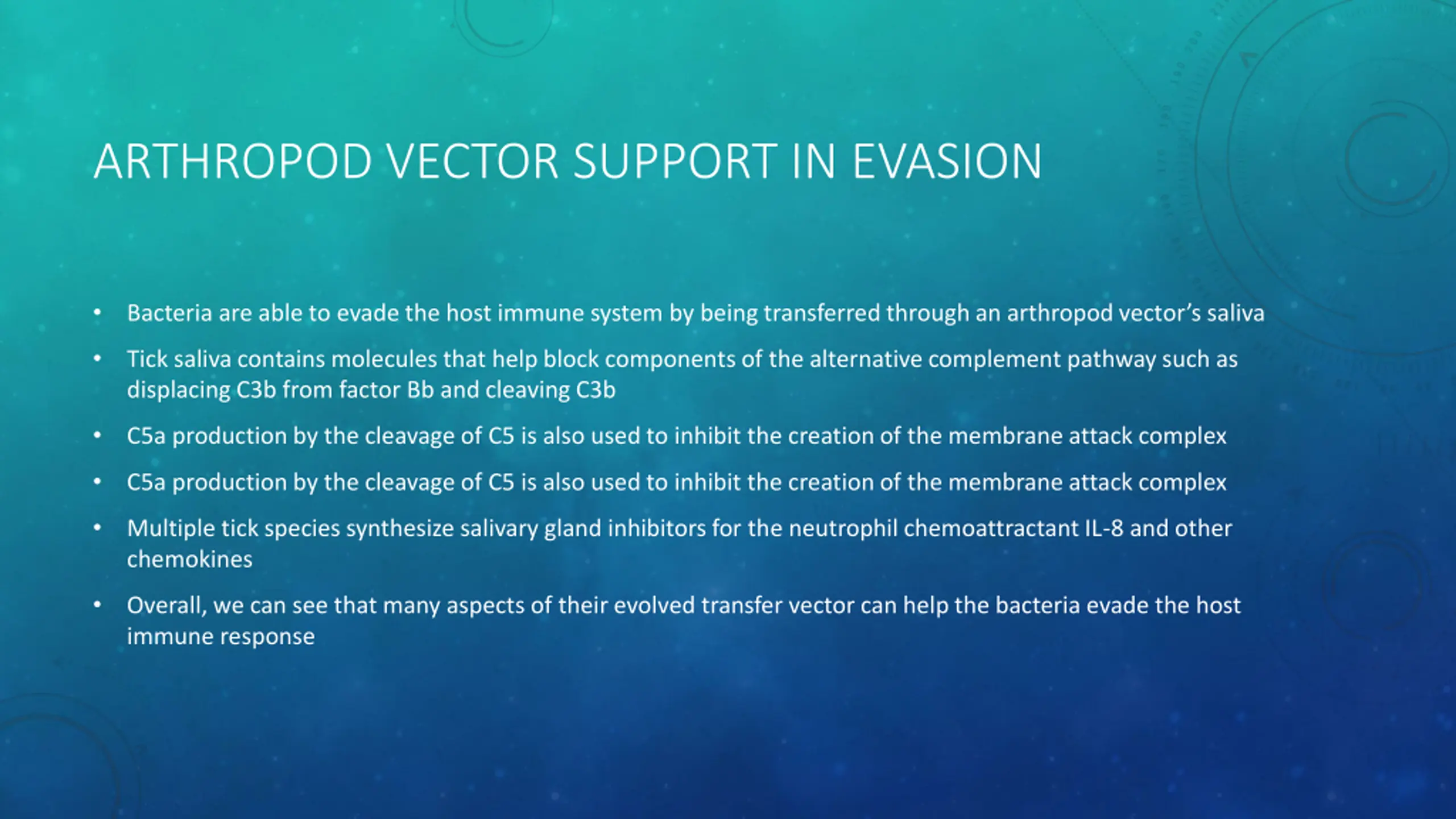 ARTHROPOD VECTOR SUPPORT IN EVASION Bacteria are able to evade the host immune system by being transferred through an arthropod vector s saliva Tick saliva contains molecules that help block components of the alternative complement pathway such as displacing C3b from factor Bb and cleaving C3b C5a production by the cleavage of C5 is also used to inhibit the creation of the membrane attack complex C5a production by the cleavage of C5 is also used to inhibit the creation of the membrane attack complex Multiple tick species synthesize salivary gland inhibitors for the neutrophil chemoattractant IL-8 and other chemokines Overall, we can see that many aspects of their evolved transfer vector can help the bacteria evade the host immune response