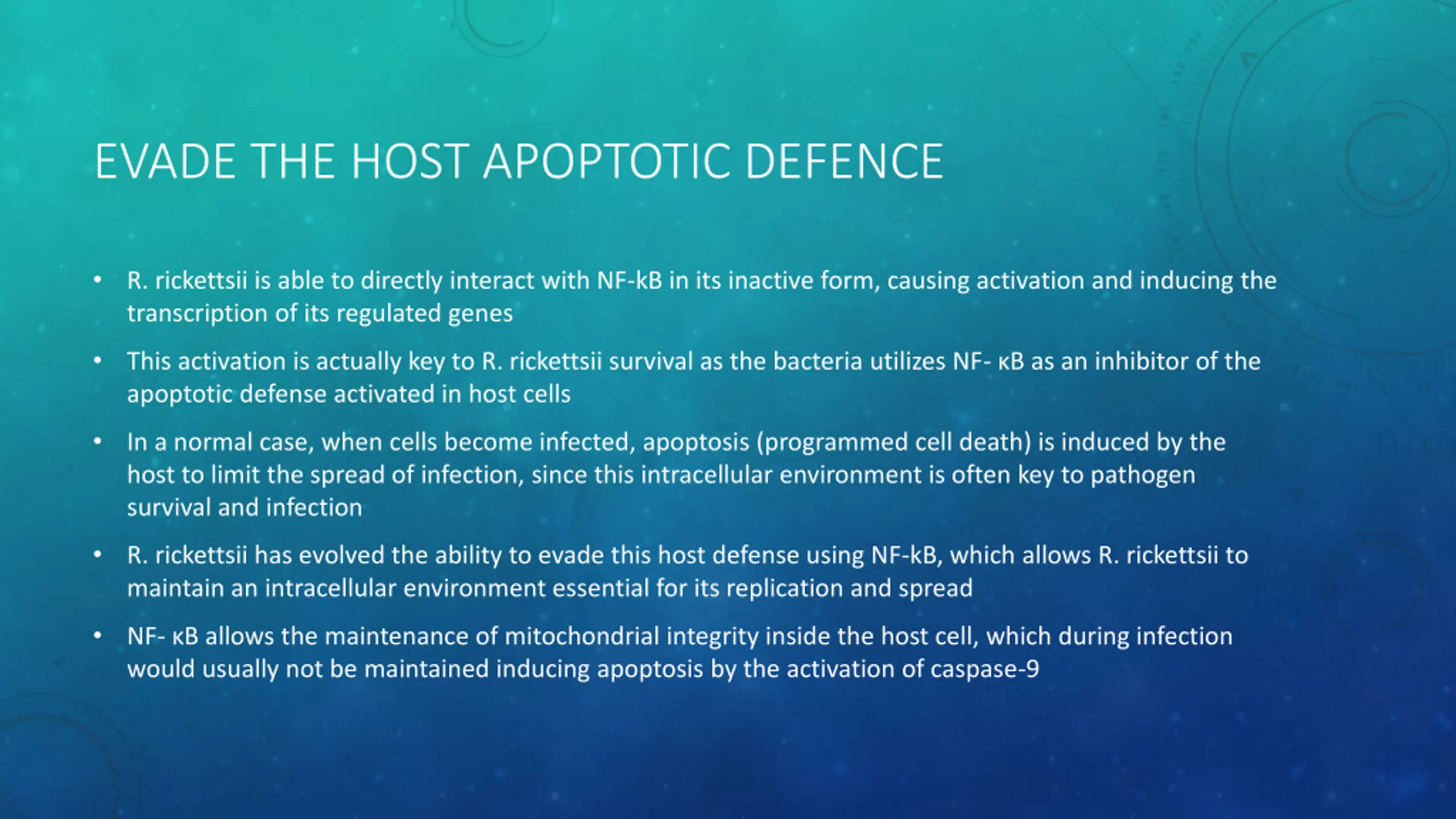 EVADE THE HOST APOPTOTIC DEFENCE R. rickettsii is able to directly interact with NF-kB in its inactive form, causing activation and inducing the transcription of its regulated genes This activation is actually key to R. rickettsii survival as the bacteria utilizes NF- B as an inhibitor of the apoptotic defense activated in host cells In a normal case, when cells become infected, apoptosis (programmed cell death) is induced by the host to limit the spread of infection, since this intracellular environment is often key to pathogen survival and infection R. rickettsii has evolved the ability to evade this host defense using NF-kB, which allows R. rickettsii to maintain an intracellular environment essential for its replication and spread NF- B allows the maintenance of mitochondrial integrity inside the host cell, which during infection would usually not be maintained inducing apoptosis by the activation of caspase-9